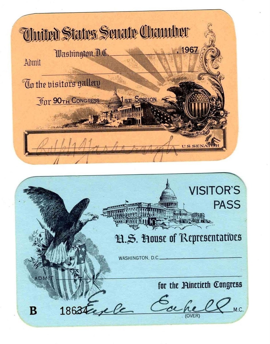 2 facsimile (stamped) signed and unused 90th Congress Passes. A United States Senate Chamber pass facsimile signed by Senator Ralph Yarborough of Texas and a United States House of Representatives pass facsimile signed by Congressman Earle Cabell of Texas. Both in mint condition. The 90th Congress met in 1967 during the Administration of President Lyndon B. Johnson.