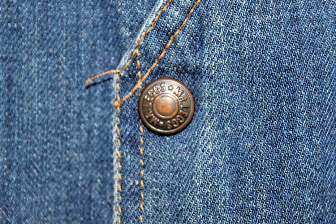 Medium weight denim, chenille applique gun + holster design, pointed hem, Mr. Leggs label