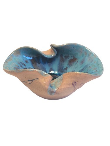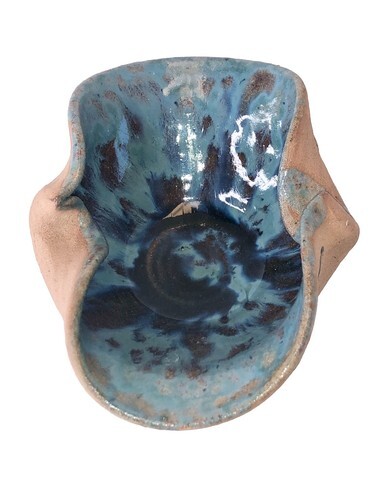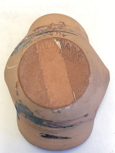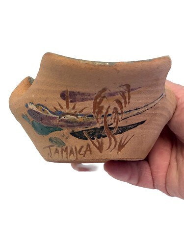 This vintage handmade pottery bowl trinket dish is a beautiful piece of art crafted in Jamaica. The abstract shape and glossy finish make it a decorative item perfect for any occasion. Made from clay with a vintage blue color, this 6-inch long bowl features a unique arts crafts style that adds a touch of charm to any space. It is a one-of-a-kind original piece with an impressed backstamp, showcasing the craftsmanship and artistic flair of the handmade production technique. A delightful addition to any collection of decorative cookware and serveware.