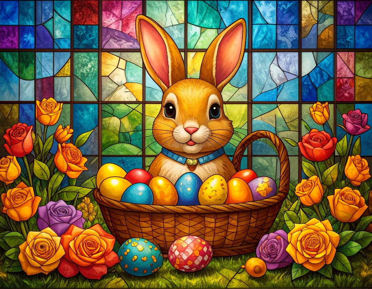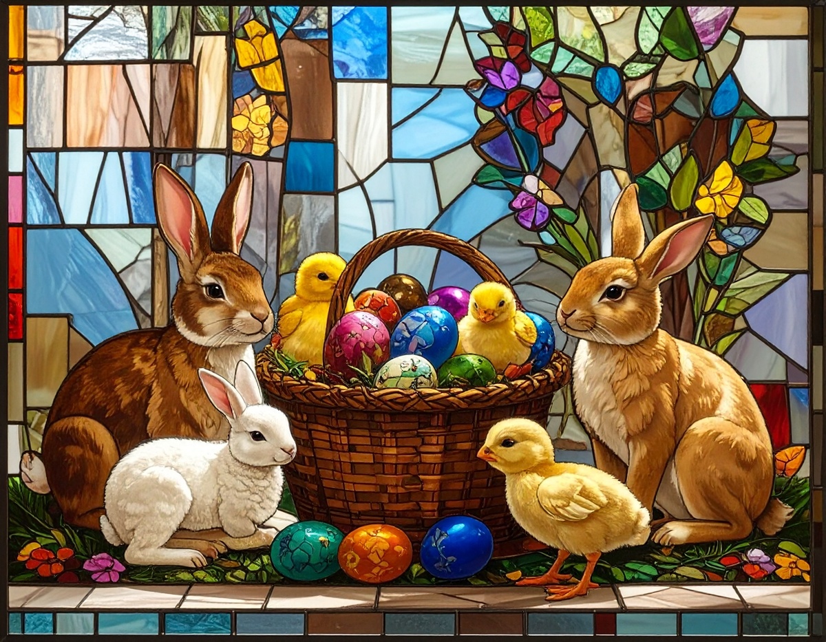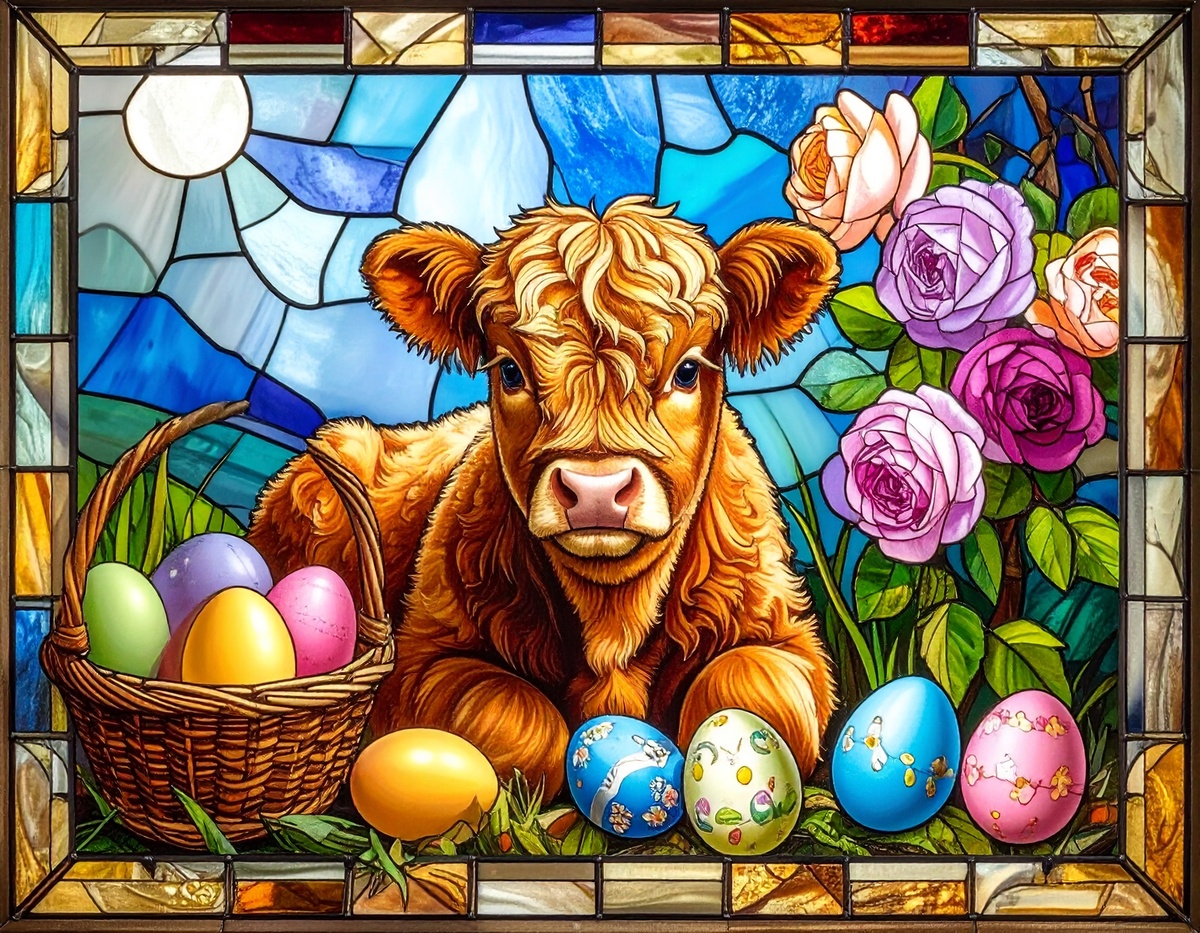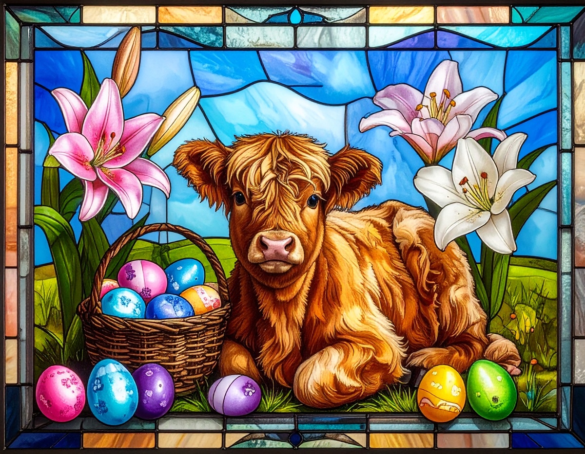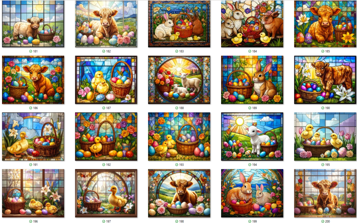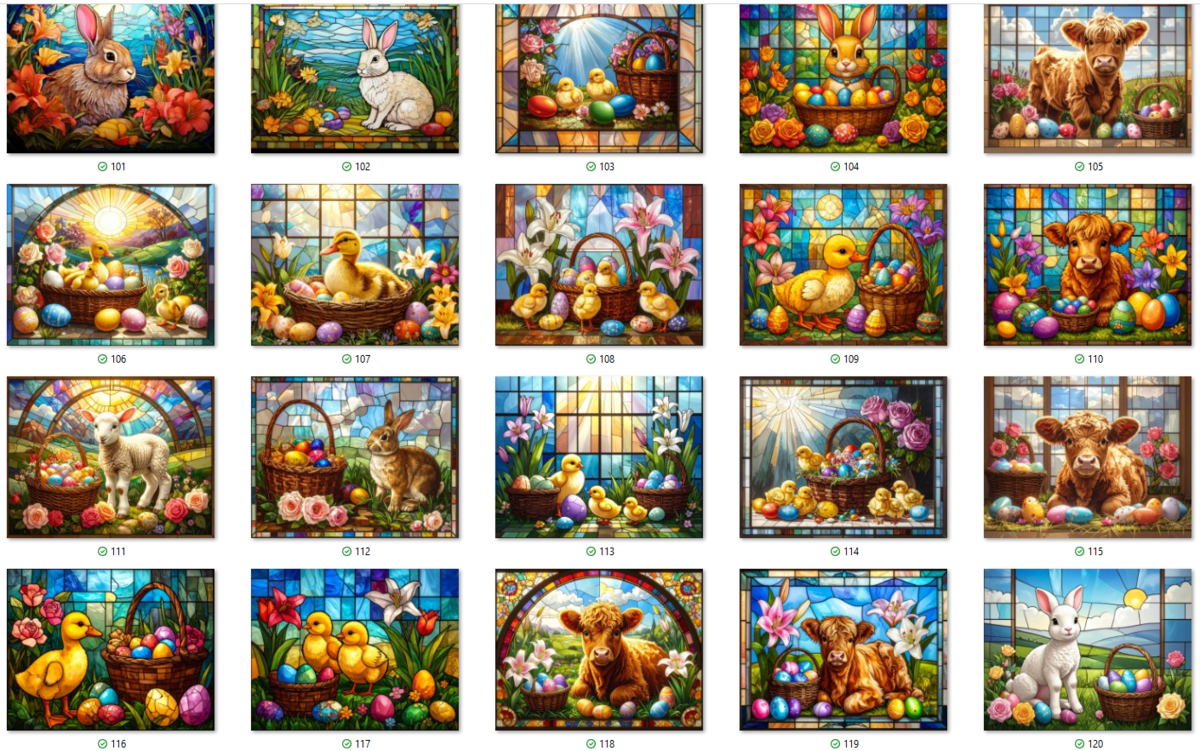 100 JPG STAINED GLASS EASTER CLIP-ART BUNDLE. Featurings bunnies, lambs, ducks, chicks and Highland cows. Lillies roses and easter eggs and baskets all beautiful colored stainede glass themed Easter designs. For commercial use of physical products only no reselling or sharting the digital files