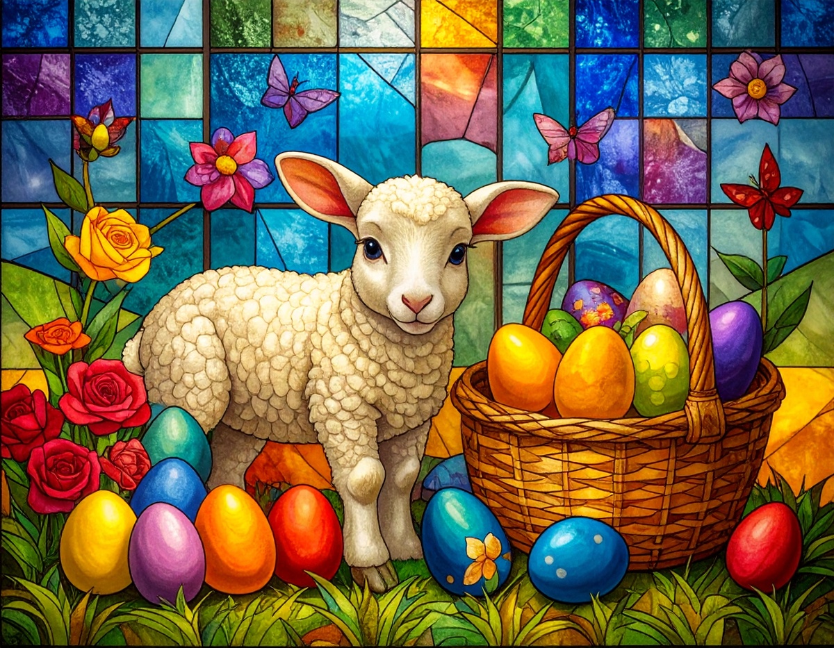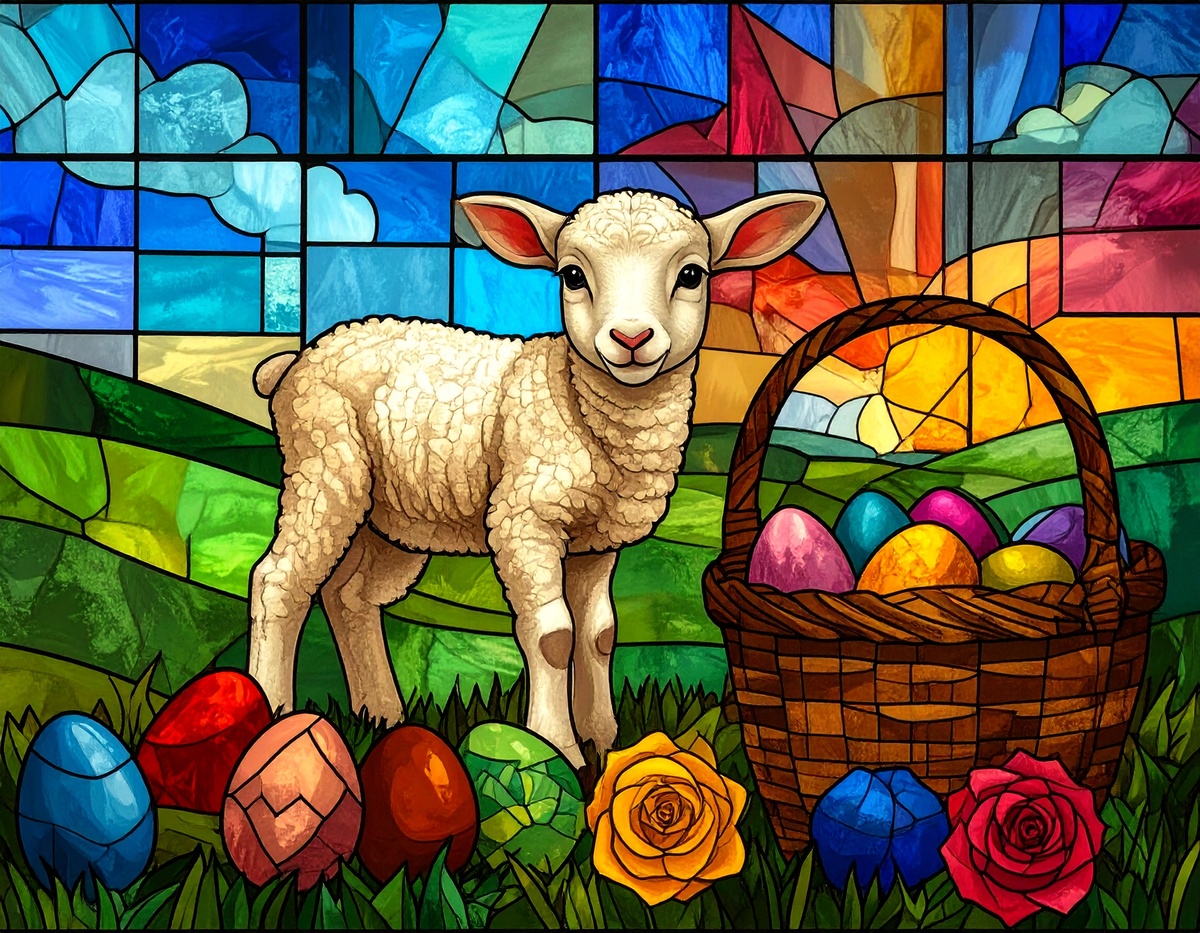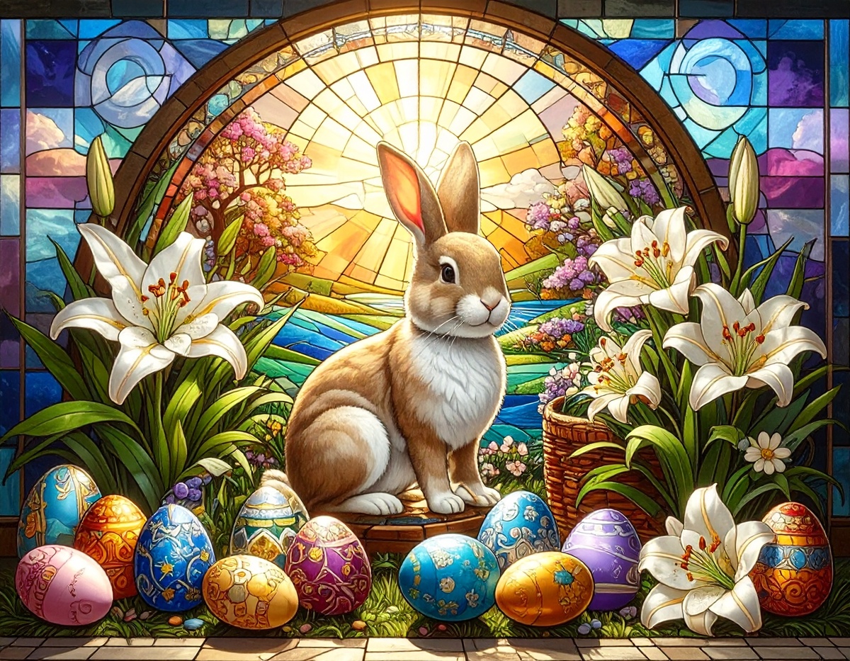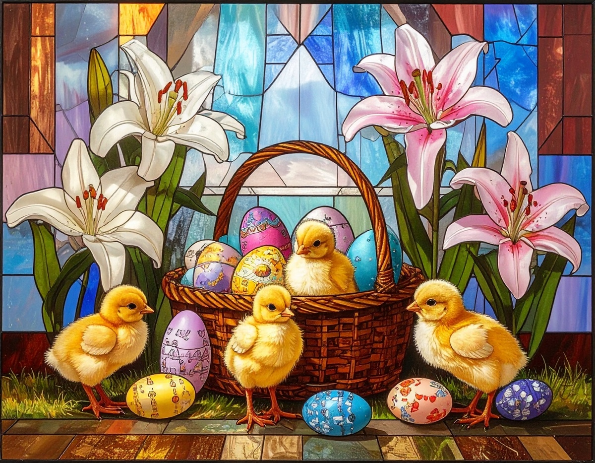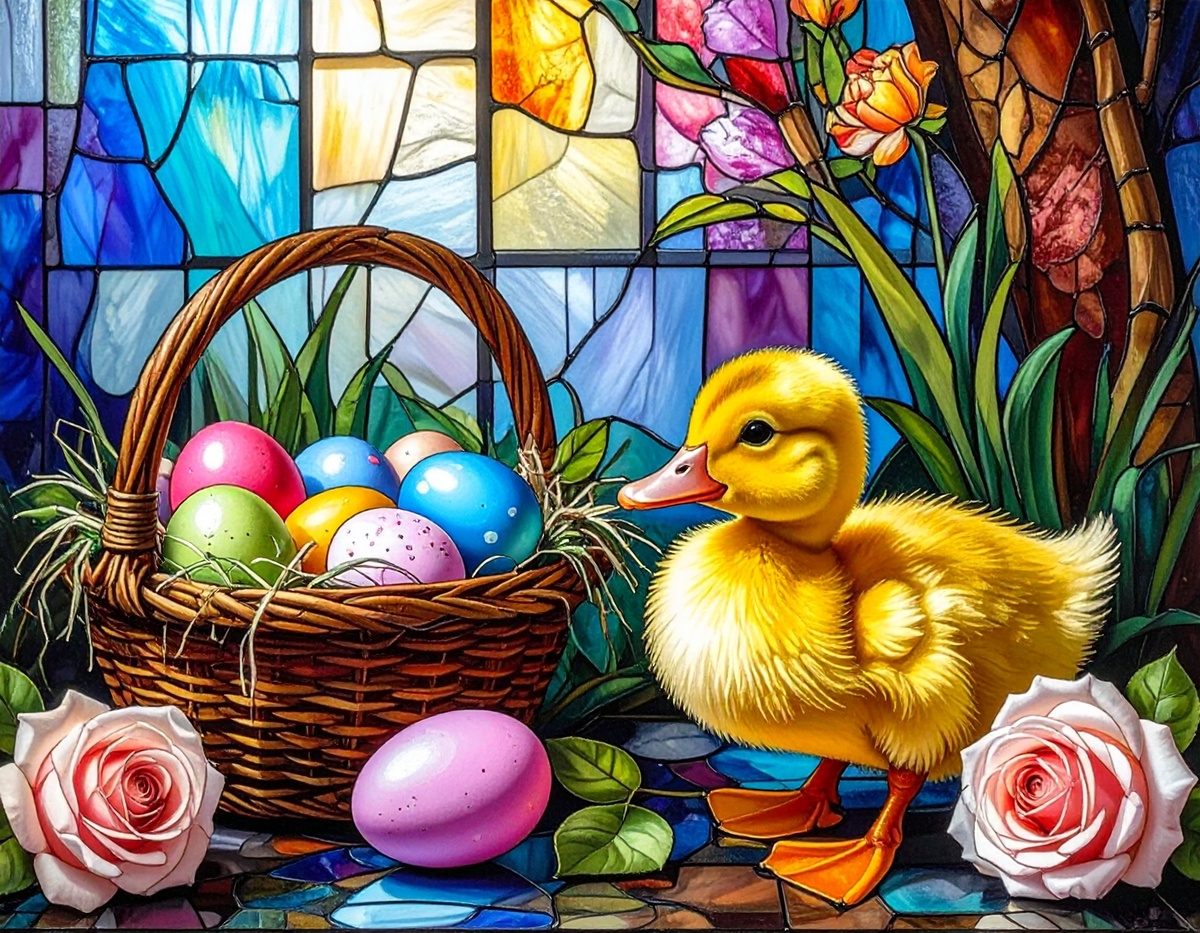 100 JPG STAINED GLASS EASTER CLIP-ART BUNDLE. Featurings bunnies, lambs, ducks, chicks and Highland cows. Lillies roses and easter eggs and baskets all beautiful colored stainede glass themed Easter designs. For commercial use of physical products only no reselling or sharting the digital files