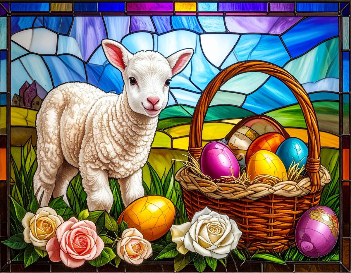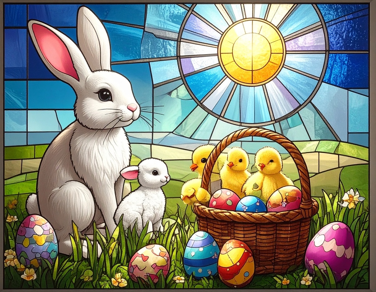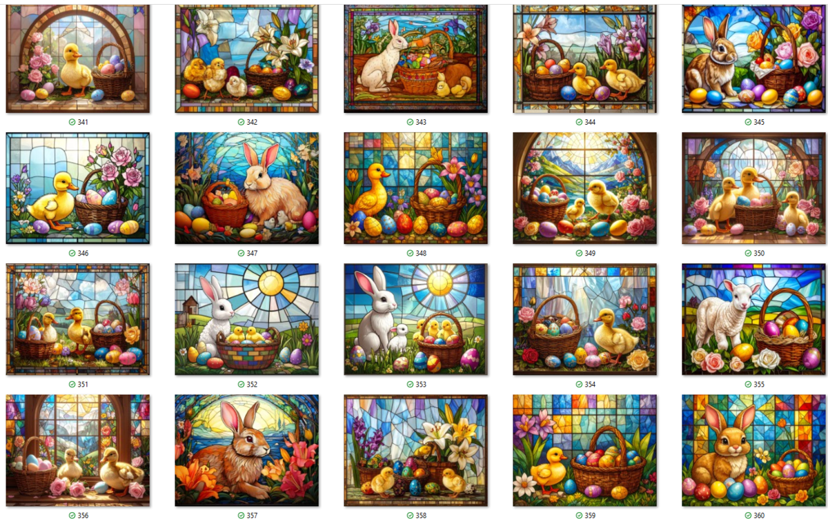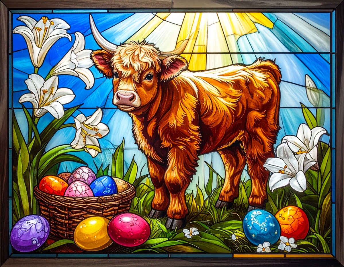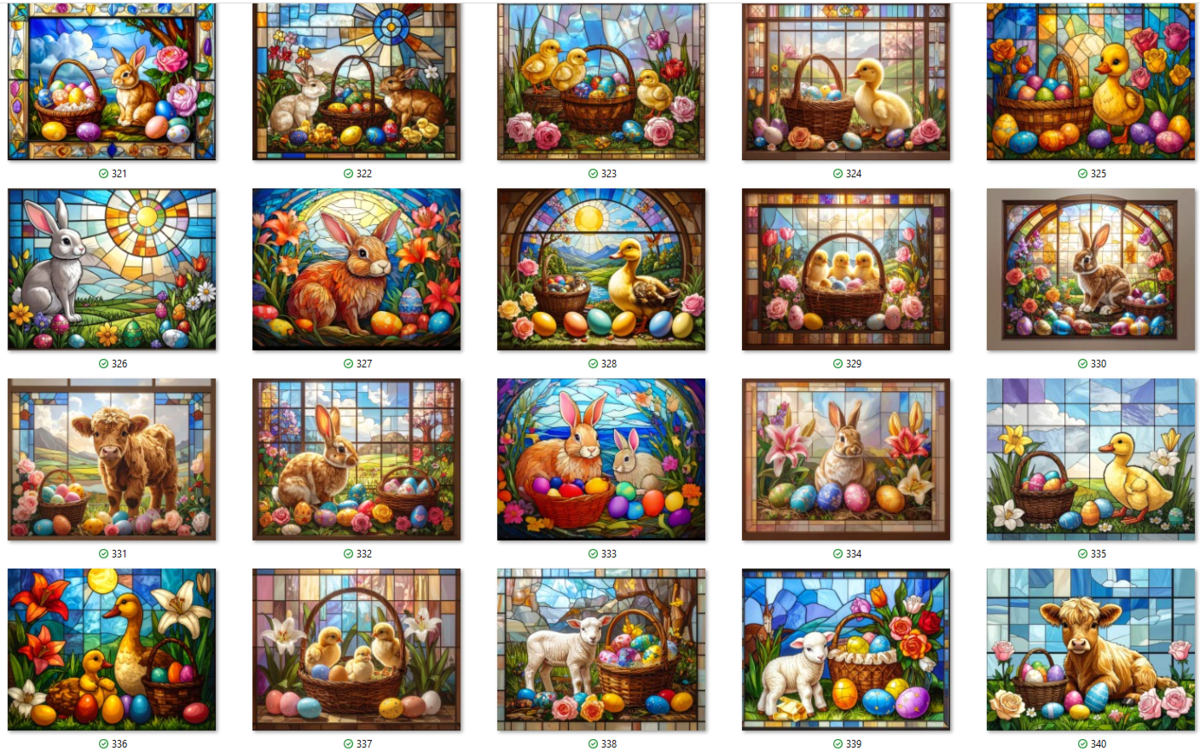 100 JPG STAINED GLASS EASTER CLIP-ART BUNDLE. Featurings bunnies, lambs, ducks, chicks and Highland cows. Lillies roses and easter eggs and baskets all beautiful colored stainede glass themed Easter designs. For commercial use of physical products only no reselling or sharting the digital files