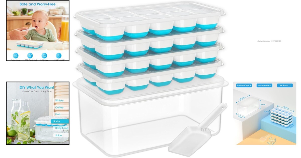 Includes 4 silicone ice cube trays with a central storage container and scoop.