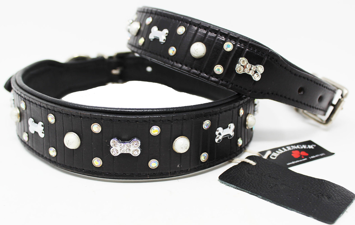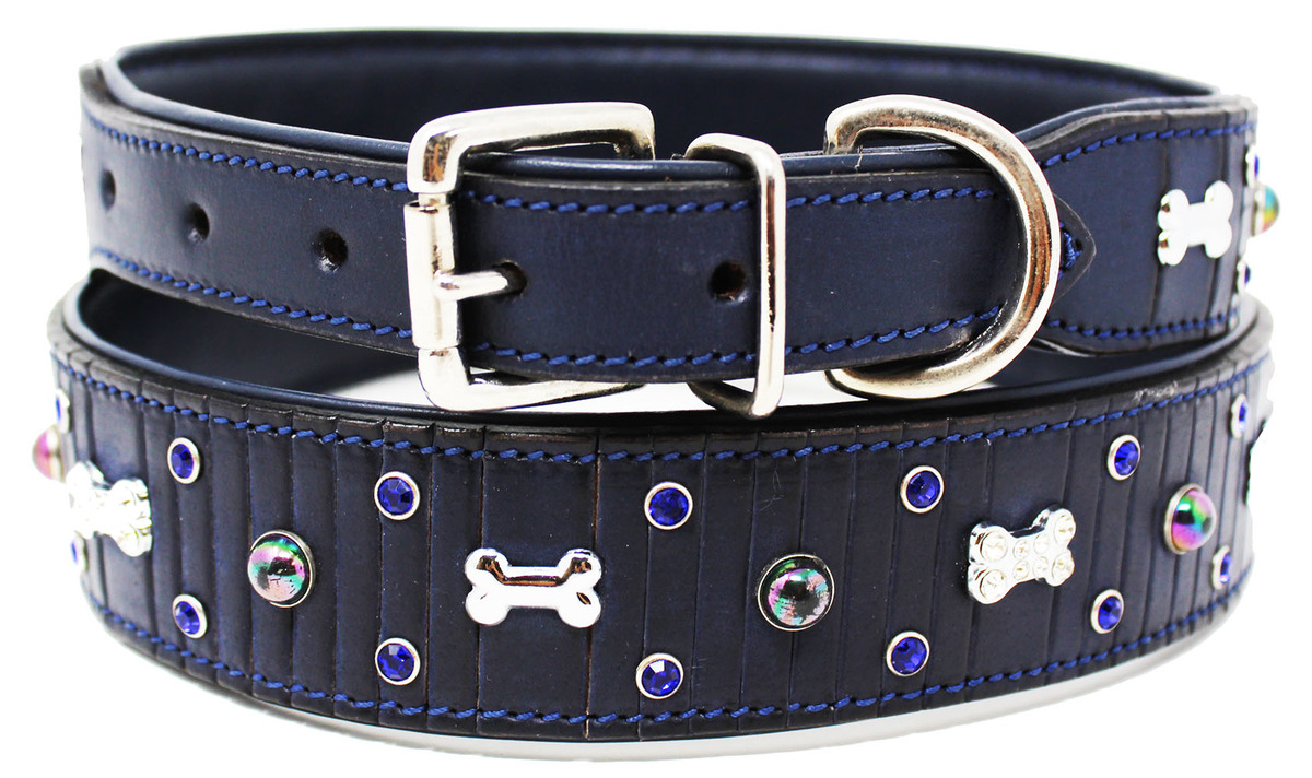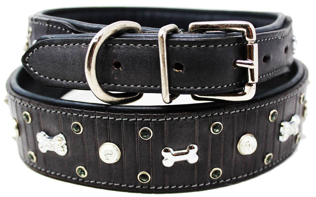 Leather Crystal Dog Bone Charm Collar Padded Double Ply Riveted Settings