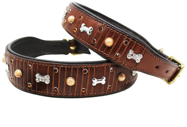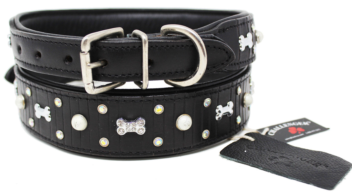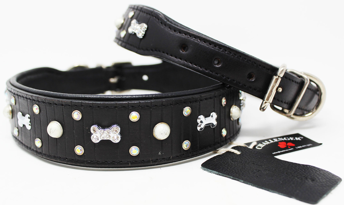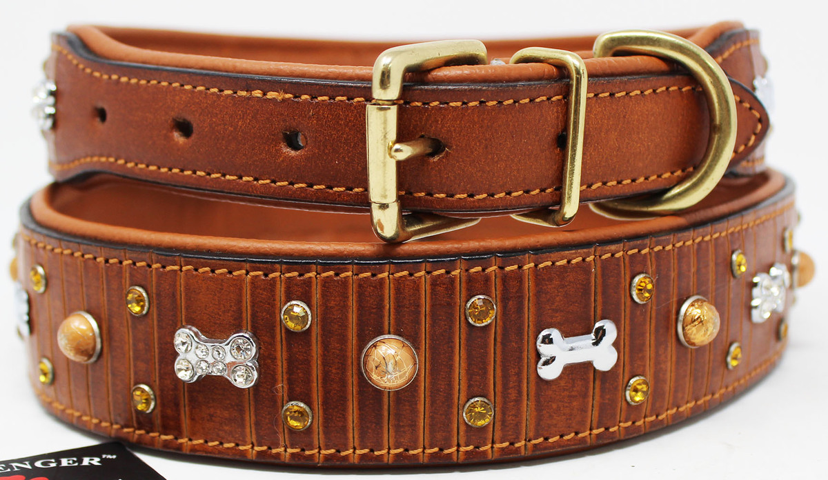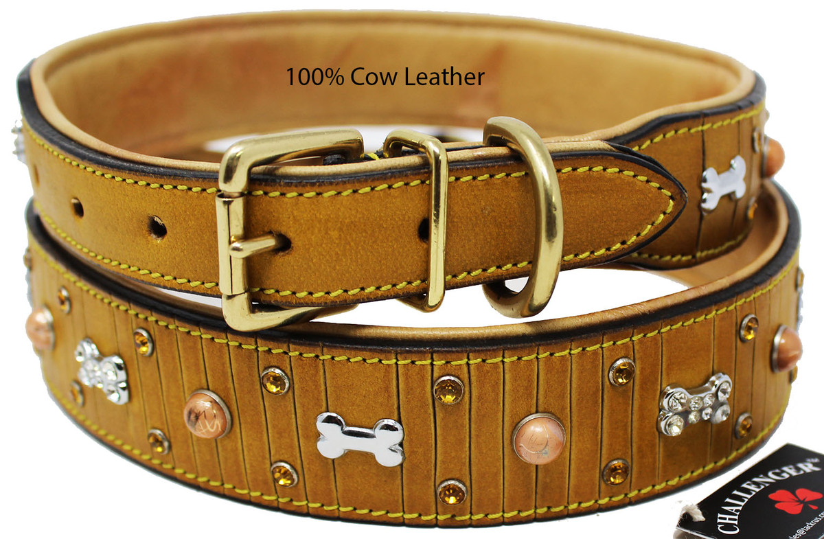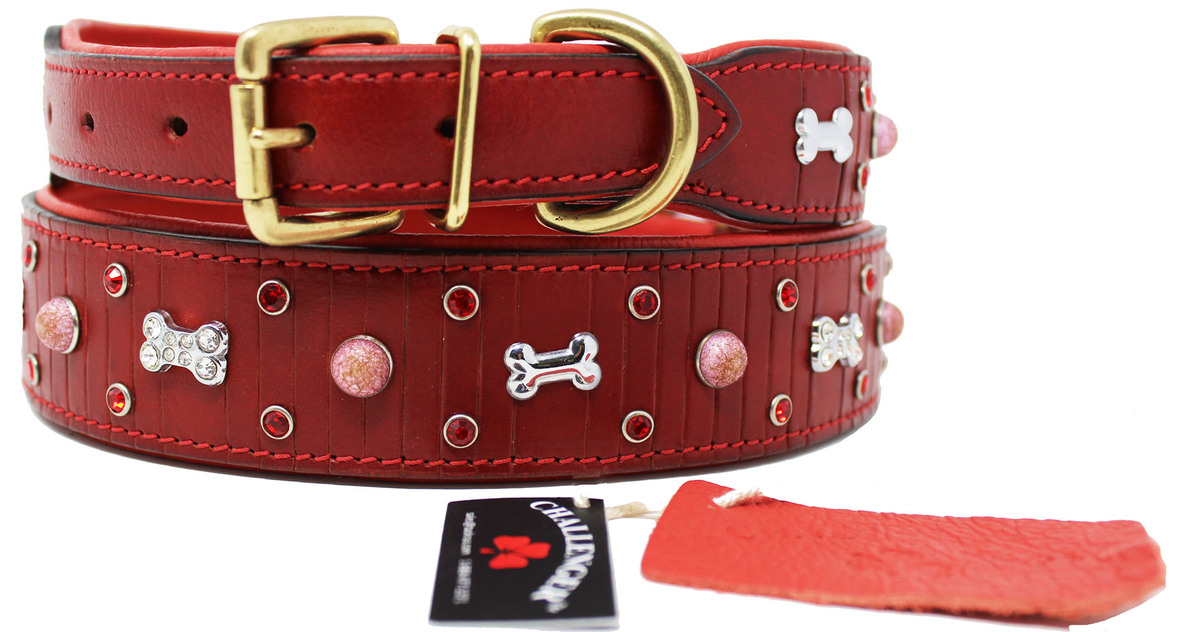 Challenger padded dog collar is made of genuine full-grain soft supple leather to provide a comfortable fit. Uniquely accented with rhinestones and dog bone charms. Available from x-small to large to accommodate different dog breeds. Includes heavy-duty solid brass hardware.