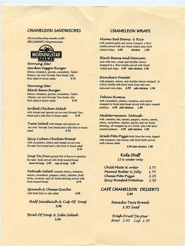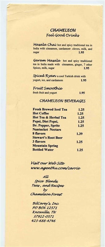 A 4 page menu on card sidekick. Cafe Chameleon Menu, located in the Great Hall at the Museum of Art in World Fair Park in Knoxville Tennessee. Circa 1990's. Measures about 4 1/4" x 11" when closed.
