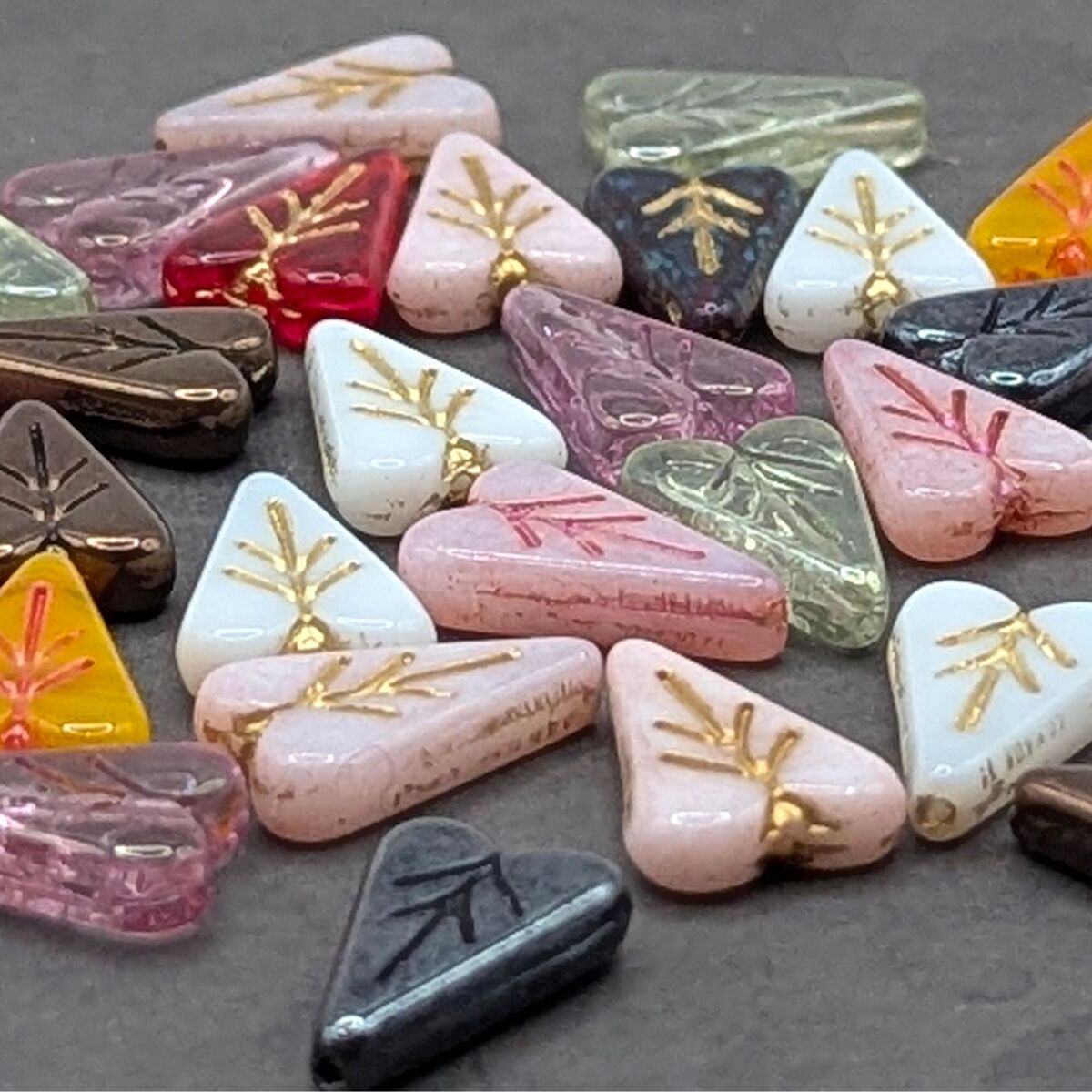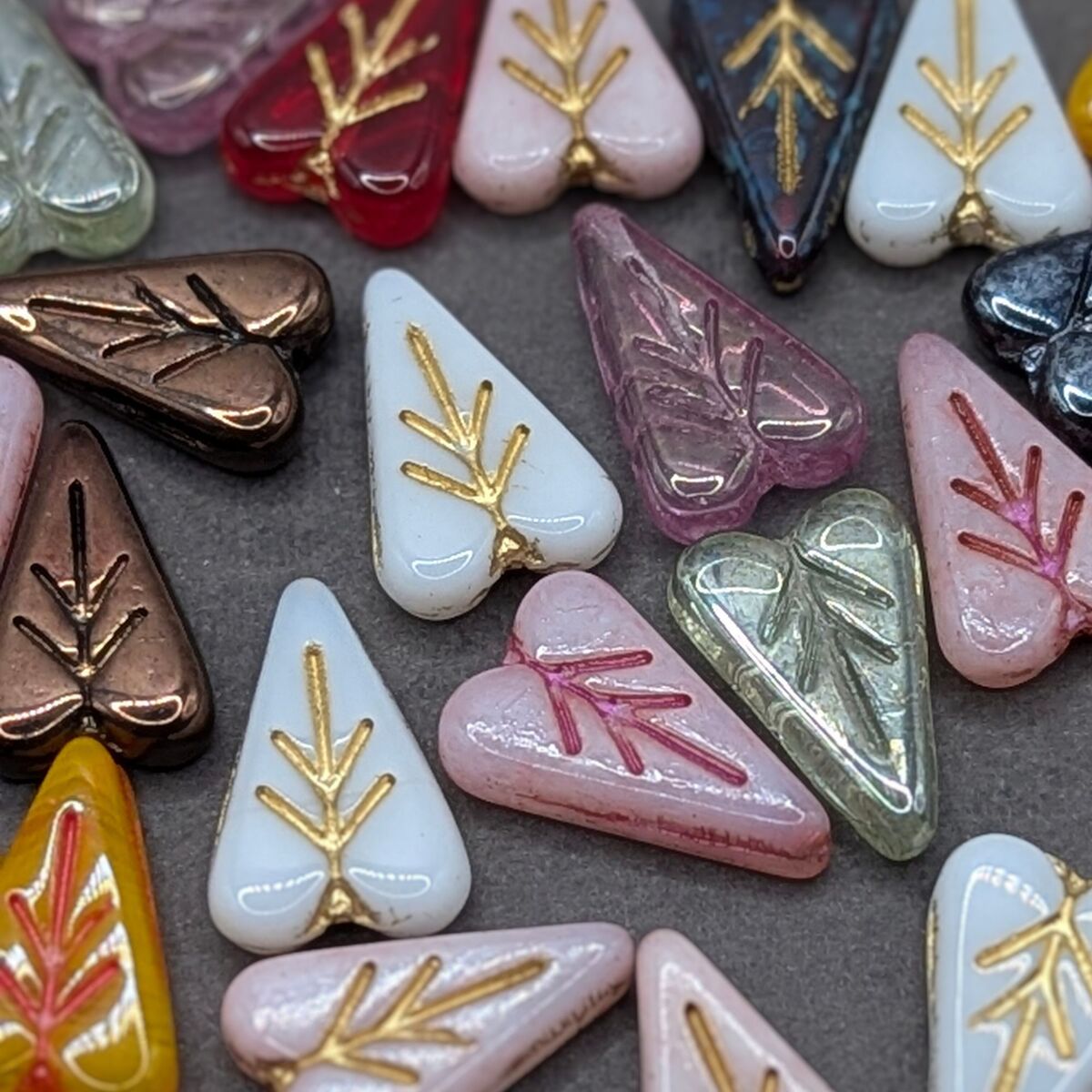 These Czech glass heart leaf beads feature a lovely multicolor mix with natural variation and a softly detailed heart-leaf shape. Each set includes a curated selection of colors, giving you beautiful variety for creative designs.