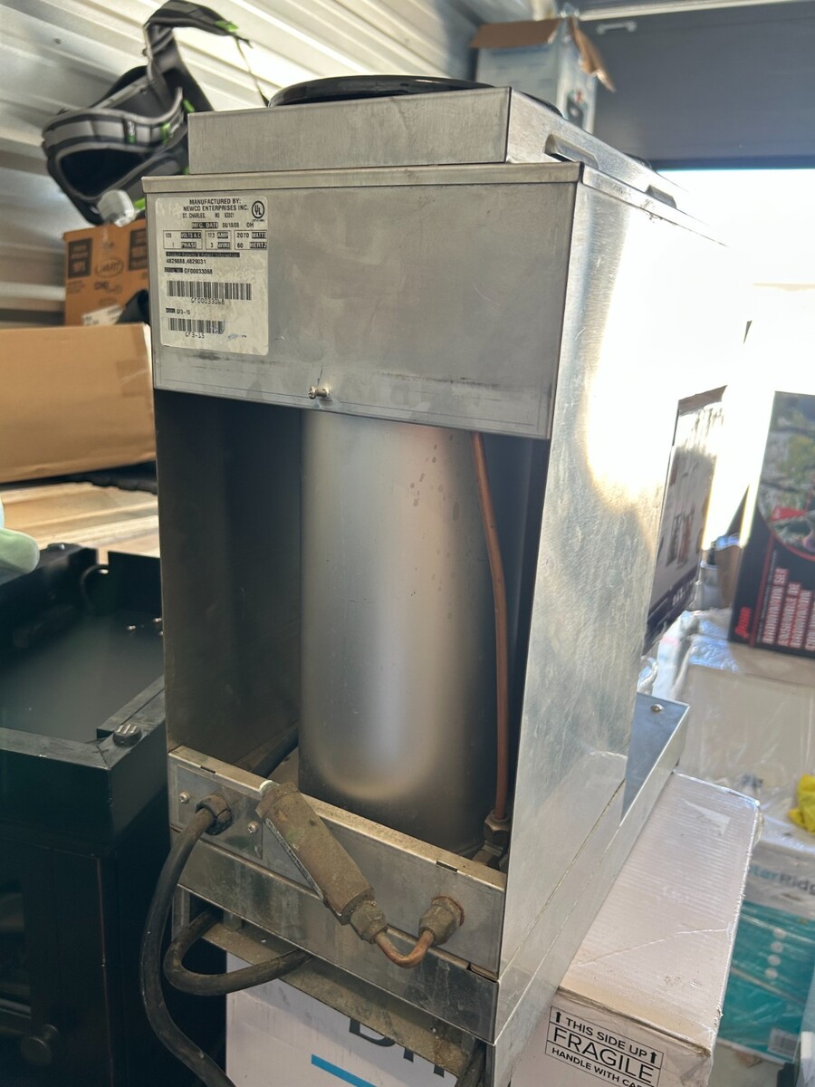 UNTESTED. Plugged in and turns on but not water tested. The water supply line connection visibly has build up, it very likely needs to be descaled before normal use. It's missing the front cover plate, and a previous user appears to have taken the back plate and rigged it to the front. Technically it could be used this way but it's not how it was originally designed to be. It's also missing the four feet that attached to the bottom, The two front feet bolt in and hold the metal trim on S that trim piece does come off without the feet being attached. It's worth noting that the feet just use a common bolt hole so replacing the feet with bolts or something more generic wouldn't be too hard to find or do. Overall it doesn't seem too bad it just needs a little bit of work or rigging.