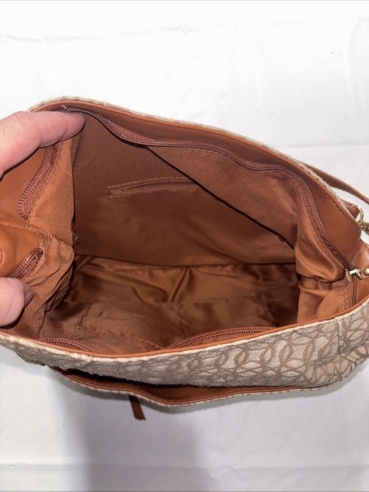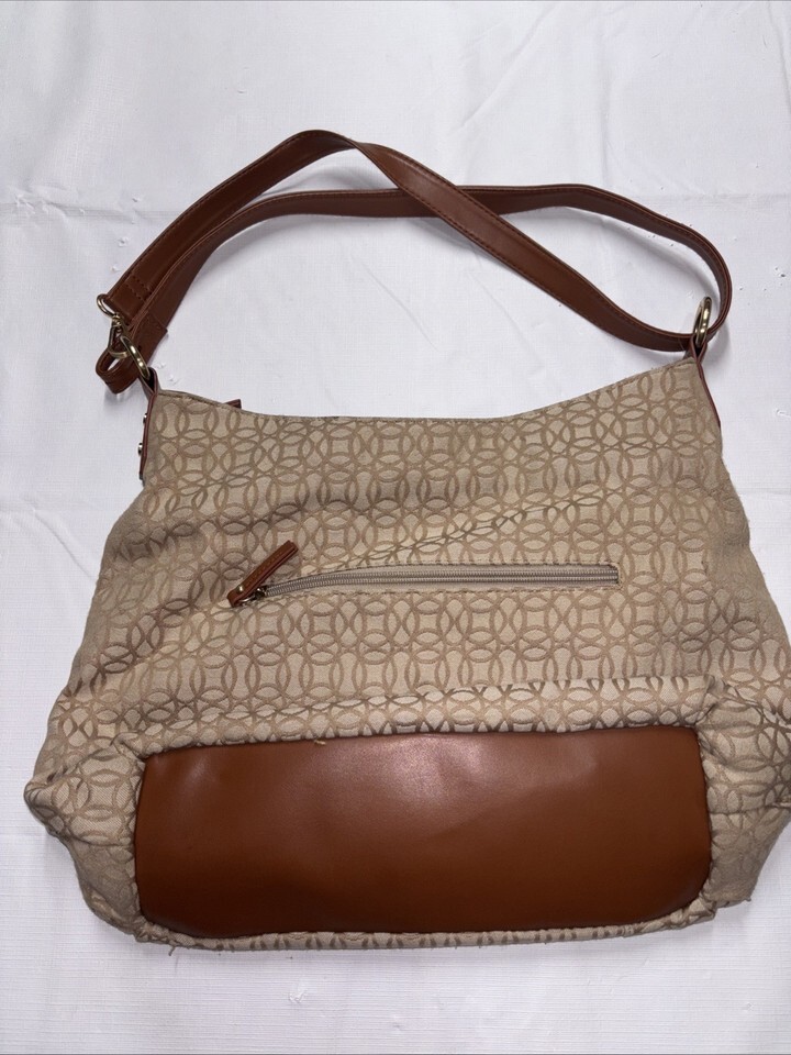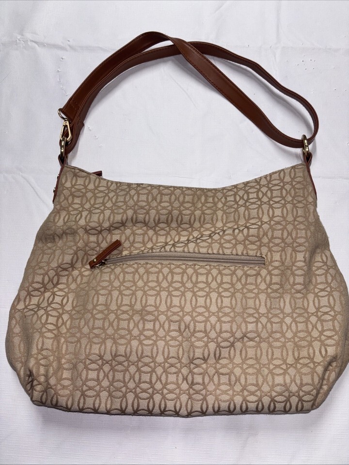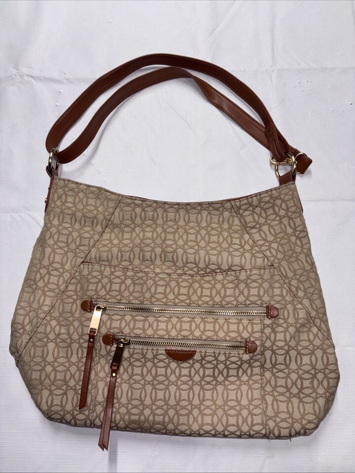The Time and Tru Women's Emelia Hobo Shoulder Handbag in Jacquard is a stylish and versatile accessory for women on the go. This hobo bag features a zip closure, brown leather handle/strap, and a beige and brown exterior with gold hardware accents. The polyester lining in brown complements the overall design, making it a perfect combination for everyday use or special occasions. The Time Emelia model offers a fashionable yet practical hobo bag option for any woman's wardrobe.