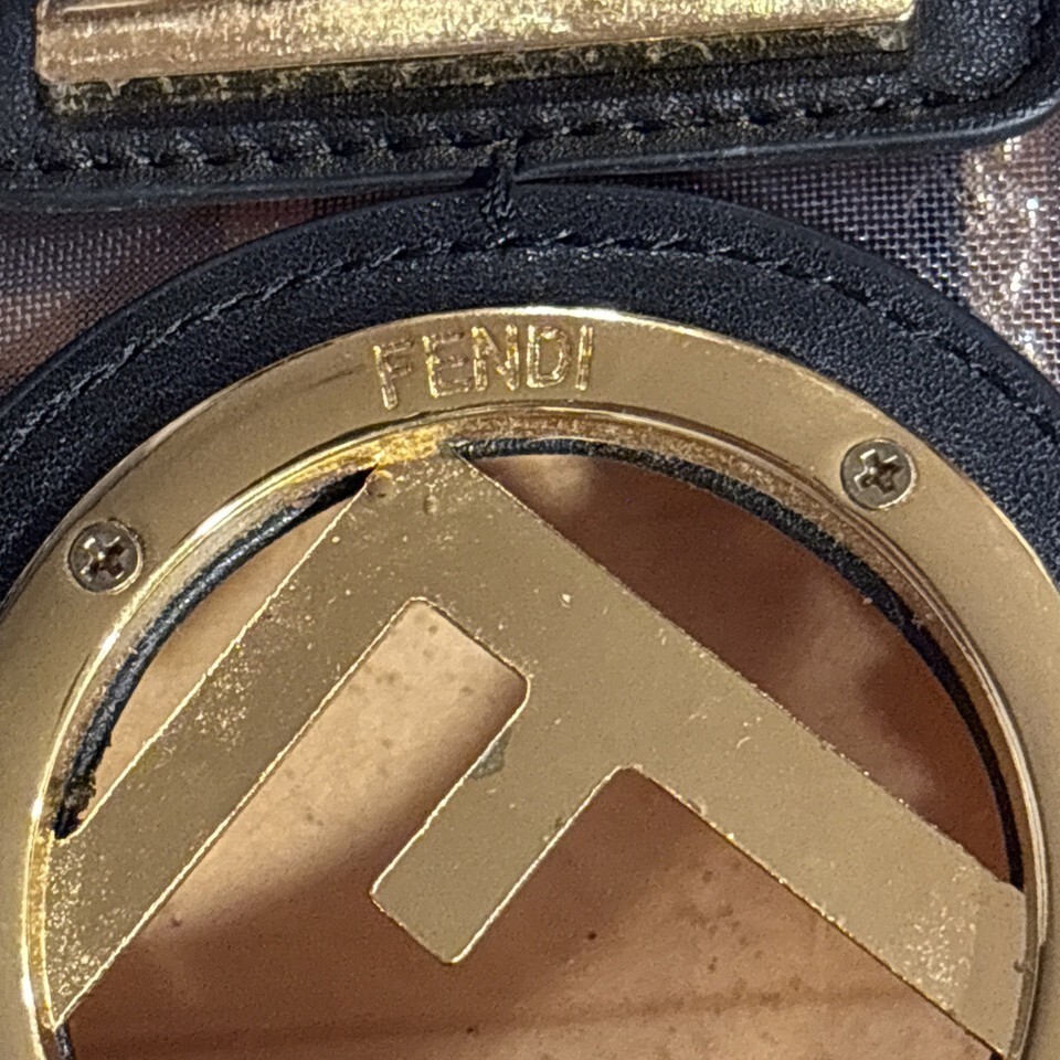 The Fendi Mesh Shoulder Bag in small size is a stylish and fashionable accessory for women. Featuring a rectangular shape with gold hardware accents, this bag is made of mesh, leather, and metal materials in a brown exterior color. The magnetic closure adds a secure touch to the design, making it perfect for everyday use or special occasions. This authentic Fendi product, part of the brand's collection, is a must-have for those who appreciate luxury and quality in their accessories. There is a small tear and some minor wear and tear to the outer circle material outlining the ?F? on the front as pictured. Some minor wear to the magnet closure. Otherwise in good condition.