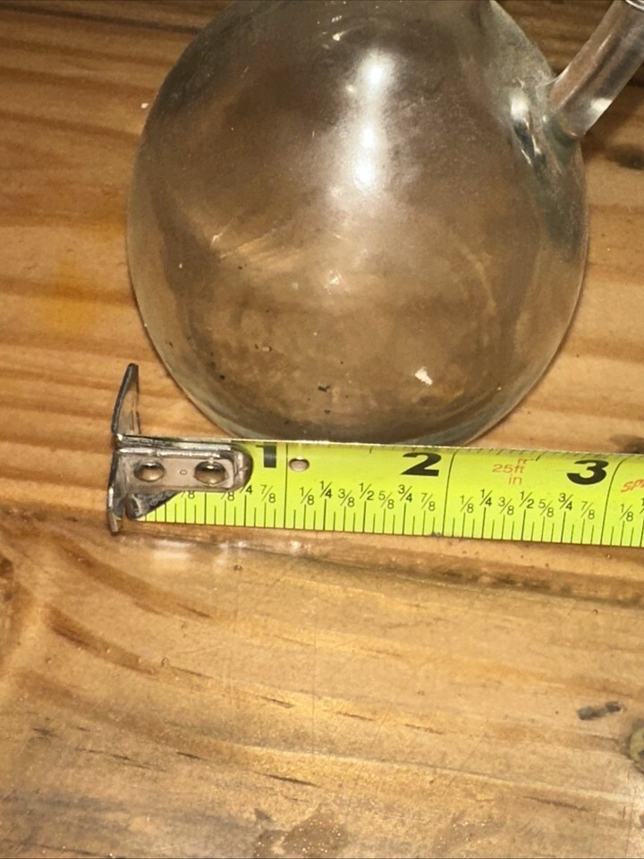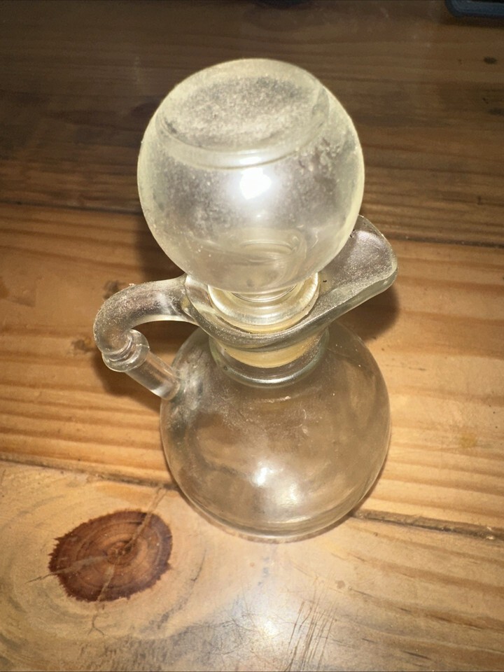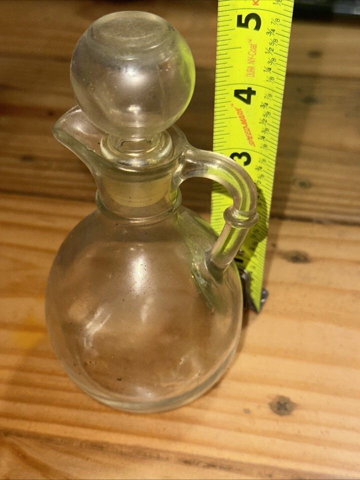 These clear glass cruetts with stoppers are vintage Mexican decanters made in Mexico. The unmarked brand ensures a small set of one, perfect for adding a touch of elegance to your dining table. With a diameter of 2.75 inches and a height of 4.25 inches, these handmade glass pieces are ideal for serving oil or vinegar at the table. The craftsmanship and design of these decorative cruets showcase traditional Mexican glassmaking techniques, making them a unique and charming addition to your collection.