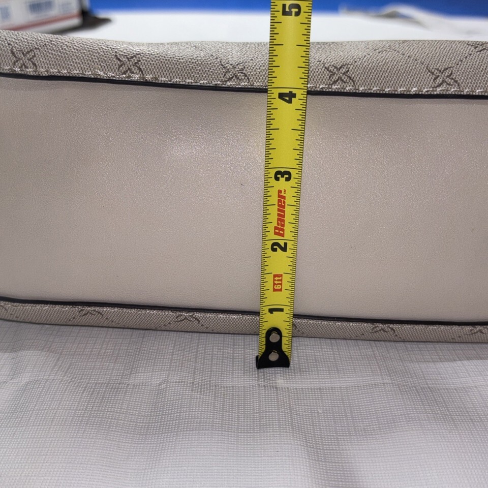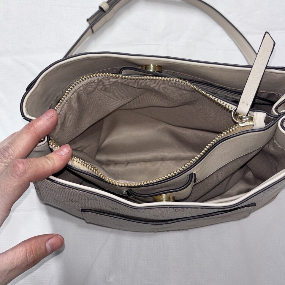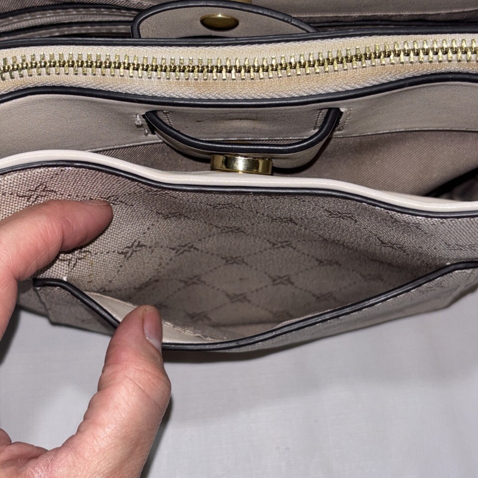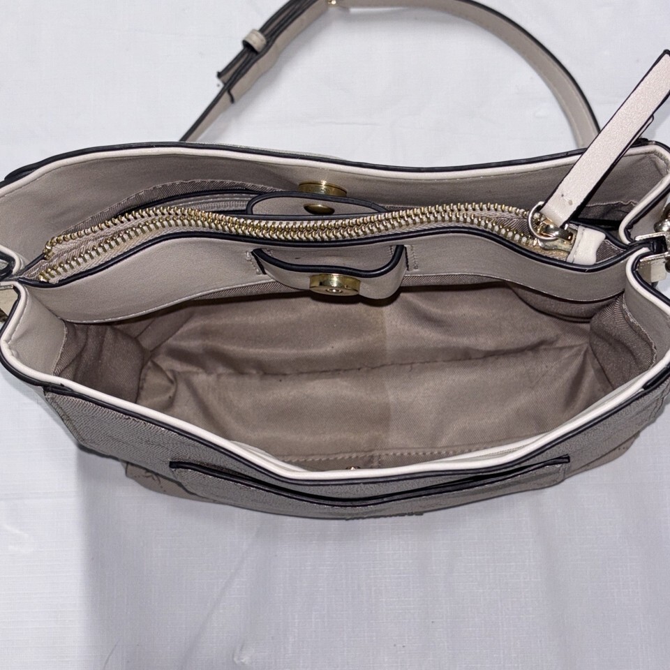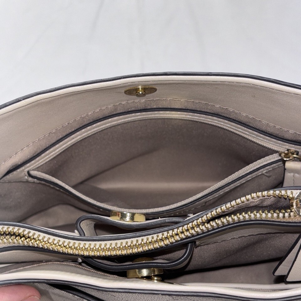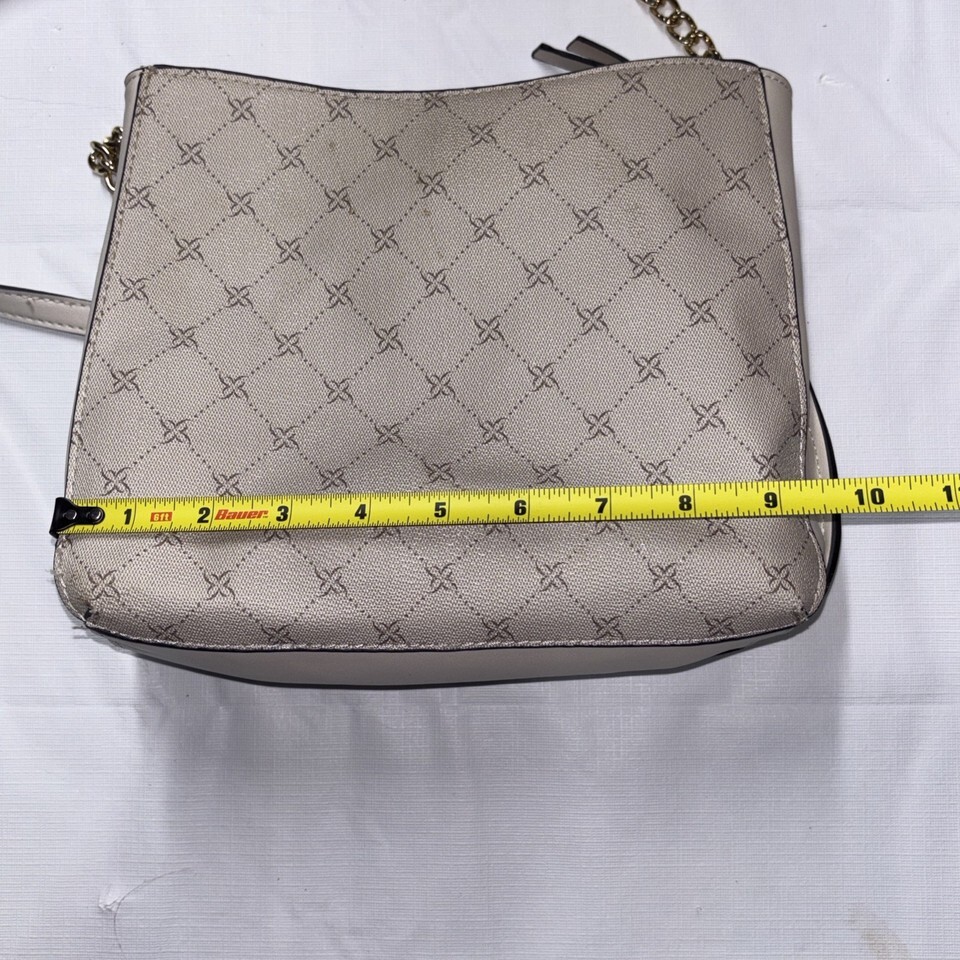 The Nine West Women's Crossbody Bag in light cream is a stylish and versatile accessory for women on-the-go. The bag features a beige handle/strap, gold hardware accents, and a beige lining for a coordinated look. Made from faux leather, this crossbody bag is both practical and chic, allowing for easy carrying of essentials while maintaining a fashionable touch. Perfect for everyday use or special occasions, this bag by Nine West is a must-have addition to any wardrobe. Used, great condition.