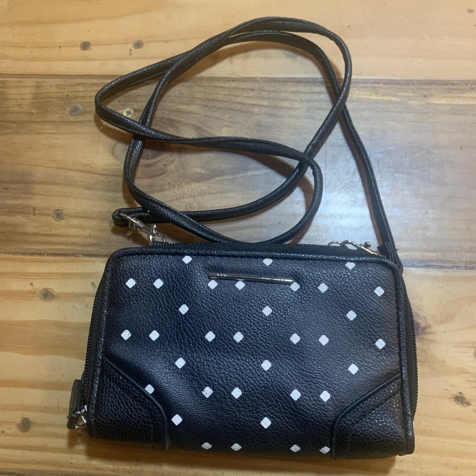 This unbranded black crossbody bag for women features a polka dot pattern and is designed in a convenient one size fit all style. The bag has a width of 7.25 inches, height of 5.25 inches, and depth of 1.0 inch, making it a compact yet functional accessory. Made from no fabric content, this regular-sized bag is perfect for everyday use and can comfortably hold essentials while on the go. With a stylish crossbody design and a sleek black exterior color, this bag is a versatile and practical choice for women.