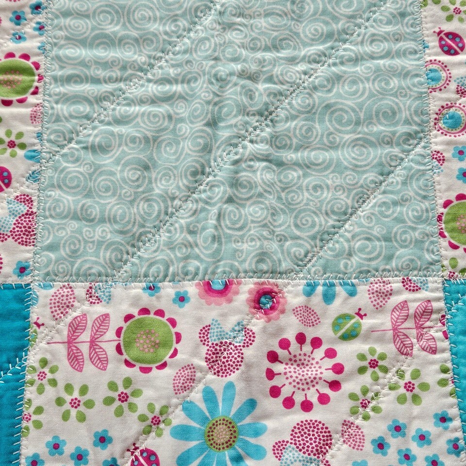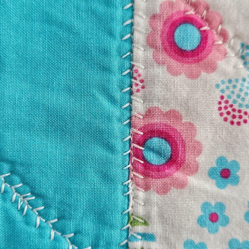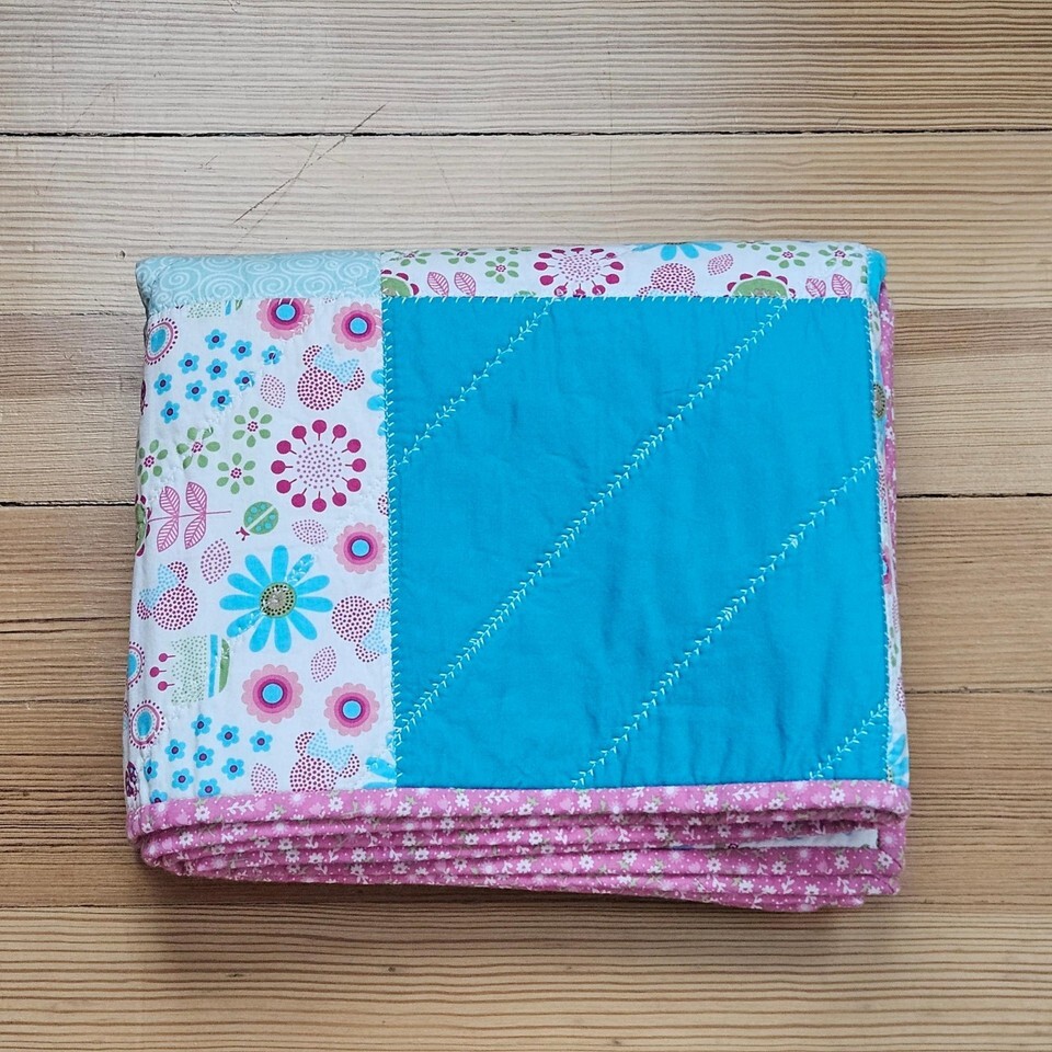 This cuddly handmade patchwork quilt is perfect for tummy time, a stroller cover, or an on the go blanket. Measuring 45.5"x38.5", it features a subtle Minnie Mouse (her head is pink and blue dots) licensed Disney cotton fabric coordinated with shades of blue on the front and pink fabric for the back. Both layers are made from 100% quilting cotton fabric. A layer of mid-weight cotton batting adds extra warmth and softness. The binding is a fun pink floral print. The quilting was done on the diagonal with decorative stitching to jazz it up a bit. Ideal for keeping your little one cozy and comfortable, this quilt is a unique addition to any nursery.
