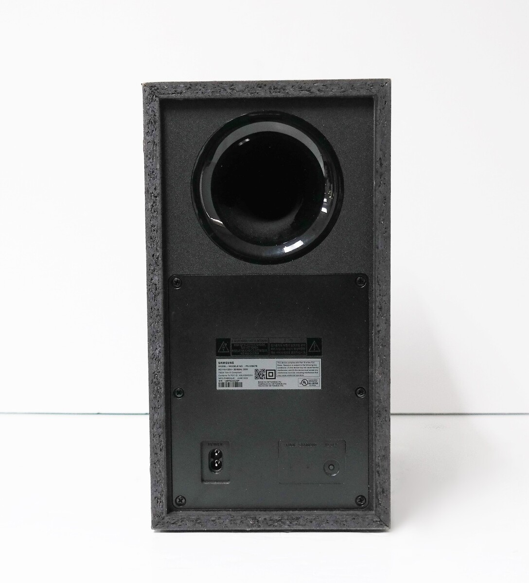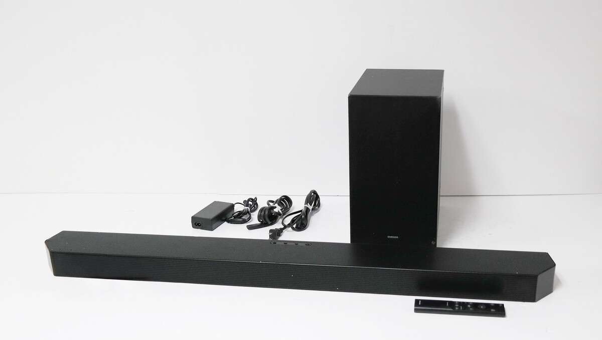 Description: Includes Soundbar, Wireless Subwoofer, Power Adapter, Power Cable, Remote Control With Batteries, HDMI Cable. Scratches on the soundbar and the sub. Dents on the grille of the soundbar. Damaged mesh on the grille of the subwoofer.