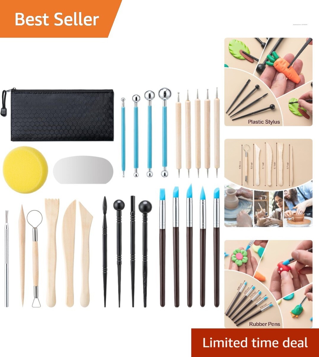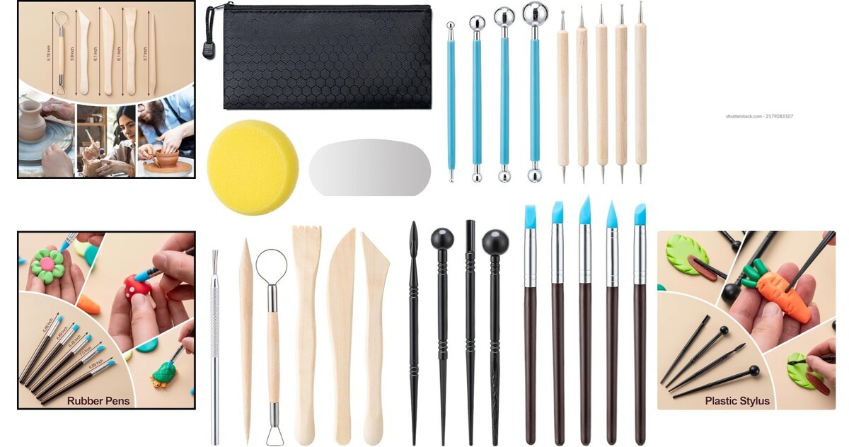 Comprehensive Set: Including 5 wooden clay tools, 5 wooden handle ball styluses, 5 rubber pens, 4 rubber handle ball styluses, 4 plastic styluses, 1 metal needle tool, 1 metal rib, and 1 pottery sponge, all conveniently packed in a zipper storage bag.