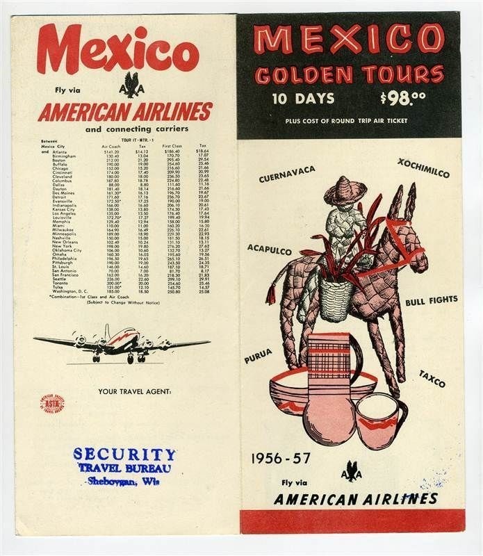 A 6 panel fold out brochure in fine condition. An American Airlines Mexico Golden Tours Brochure for 1956 -1957 Tours. Includes, fares, itineraries, and more.