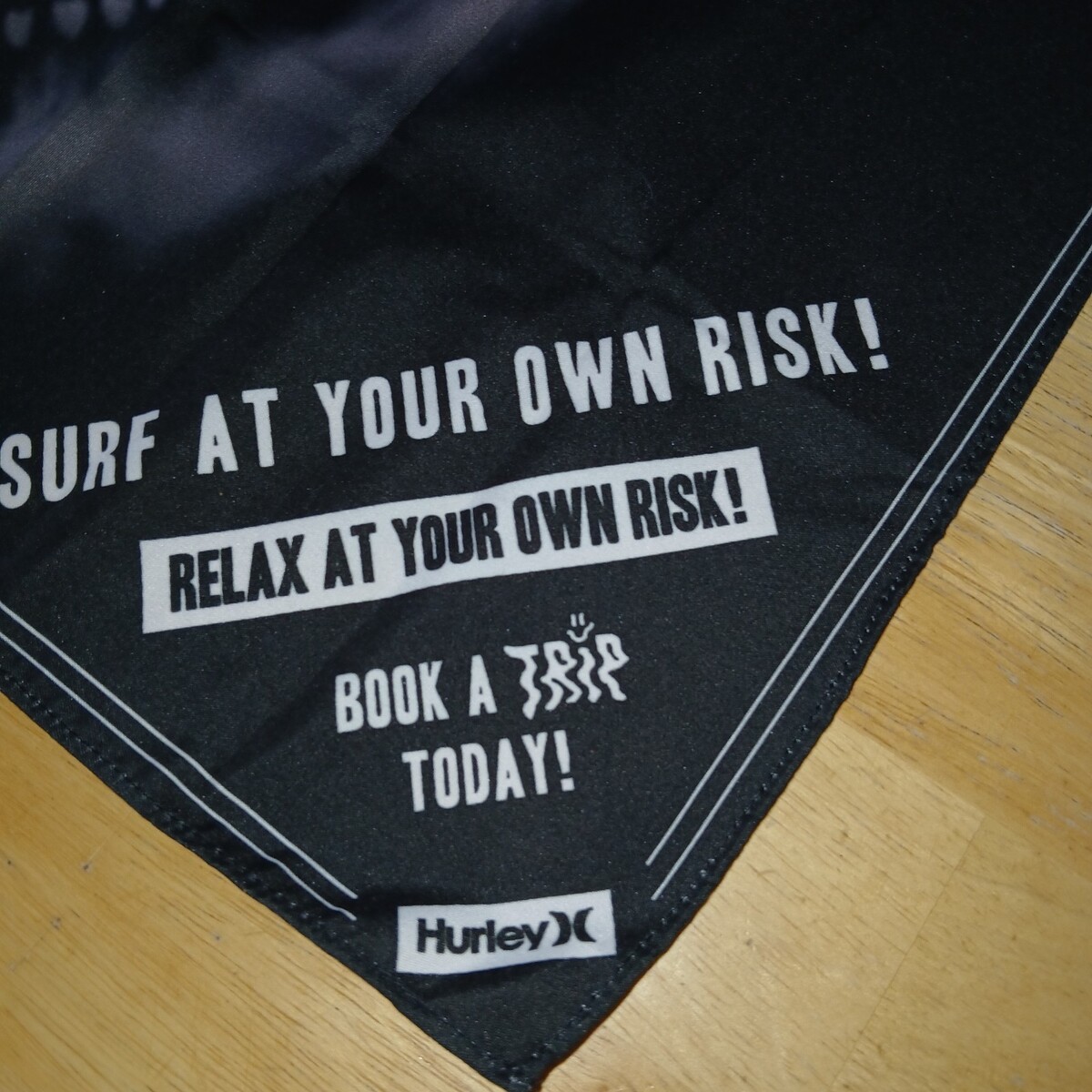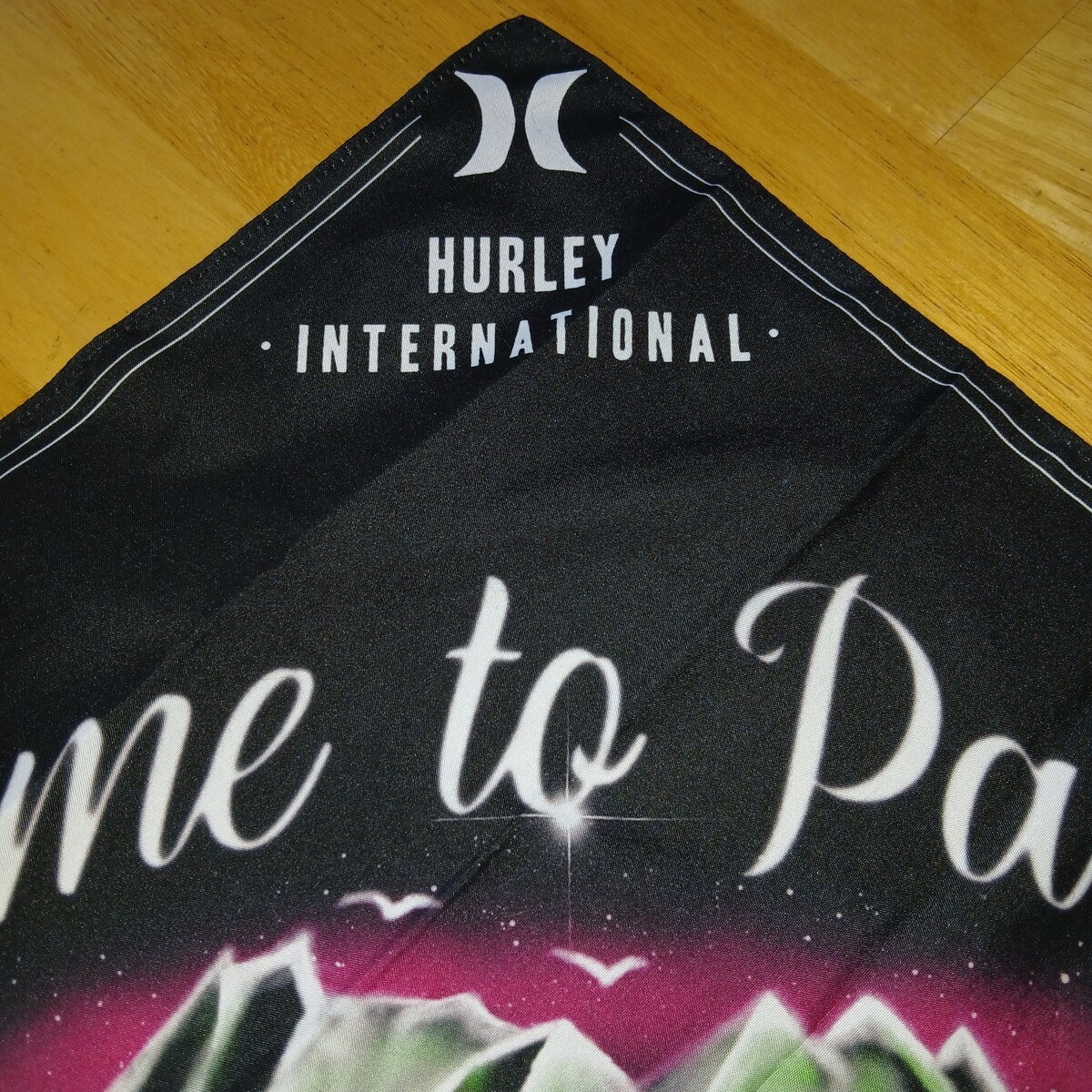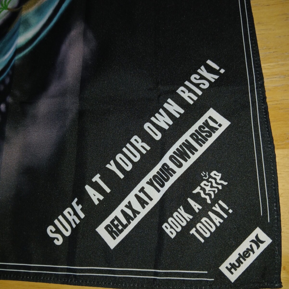 THIS IS A SCARF FROM HURLEY X INTERNATIONAL WITH SURFING STUFF FROM 1999 "WELCOME TO PARADISE" AND OTHER GRAPHICS AS SEEN IN THE PICTURES. IT IS IN LIKE-NEW CONDITION.