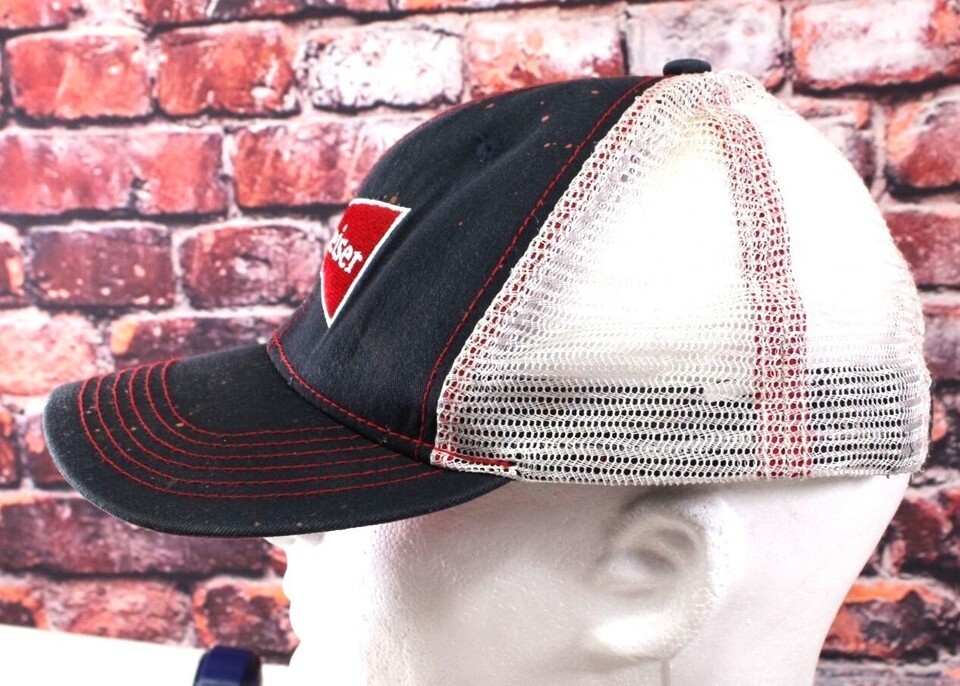 This Budweiser trucker hat features a classic red and black design with a mesh back, providing breathability and comfort. The adjustable snapback allows for a customizable fit, making it suitable for various head sizes. Its prominent Budweiser logo adds a touch of iconic branding, appealing to fans and collectors alike.