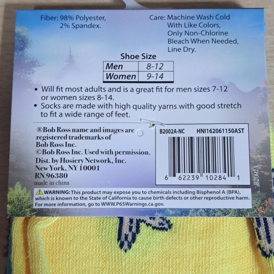 Embrace your love for the iconic painter with these Bob Ross The Joy of Painting novelty socks. The unisex lot includes two pairs, each showcasing a colorful and cheerful design inspired by Bob Ross's beloved art. Perfect for everyday wear, these socks are a great way to add a touch of whimsy to any outfit.