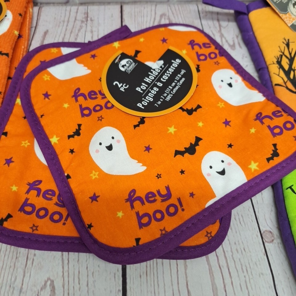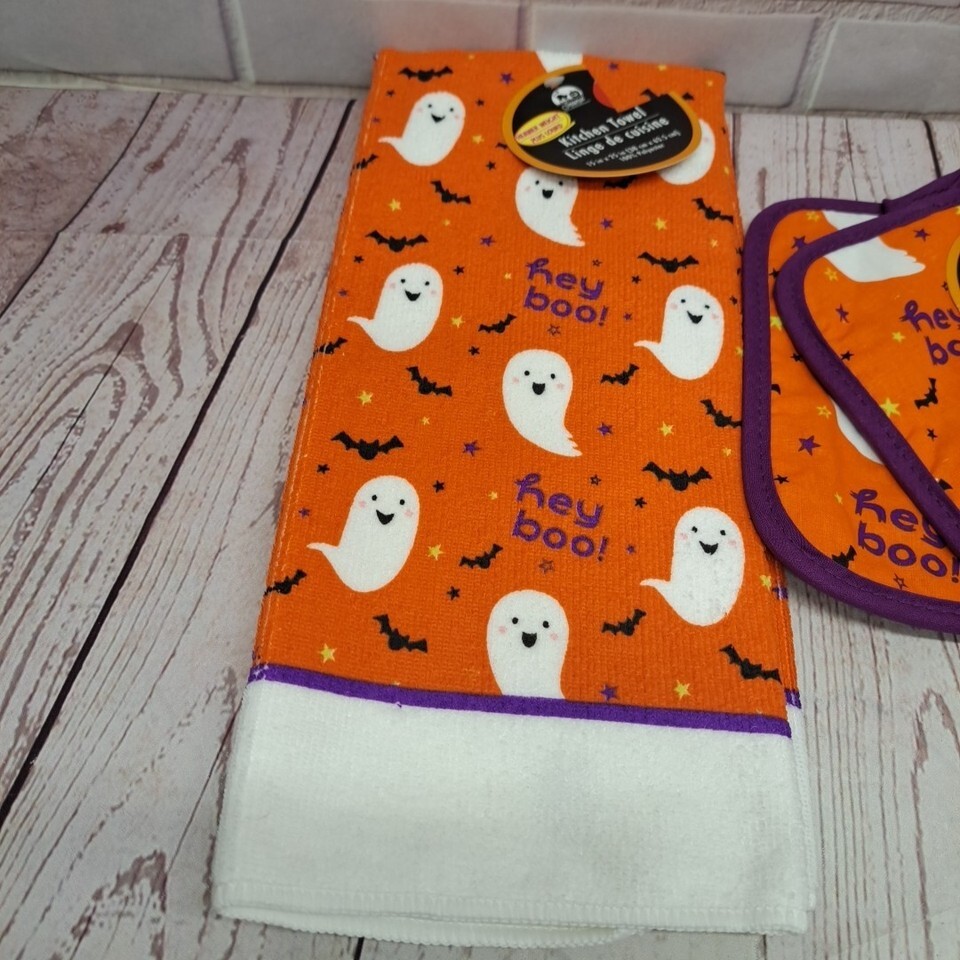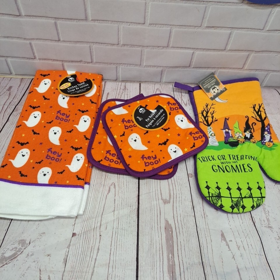 Halloween Ghost & Gnomes Kitchen 4pc Set - Towel, Pot Holders, Oven Mitt Orange