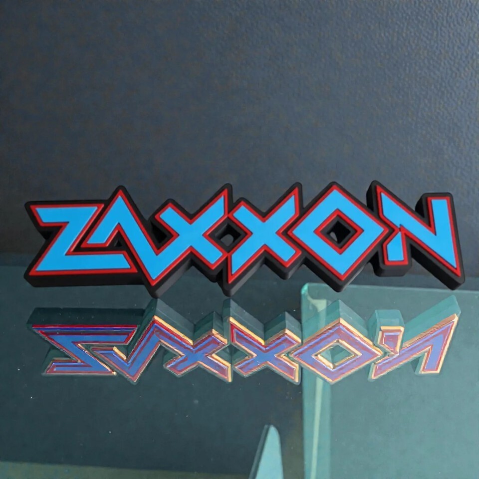 Showcase your appreciation for classic arcade gaming with this Zaxxon Sega logo item. This unique piece features the iconic Zaxxon logo in a striking 3D design, combining vibrant blue lettering with red outlines and a black base. It can function as both a lapel pin for personal adornment or a decorative sign to display your retro gaming passion. This collectible is in excellent condition, ready to be added to any fan's collection.
