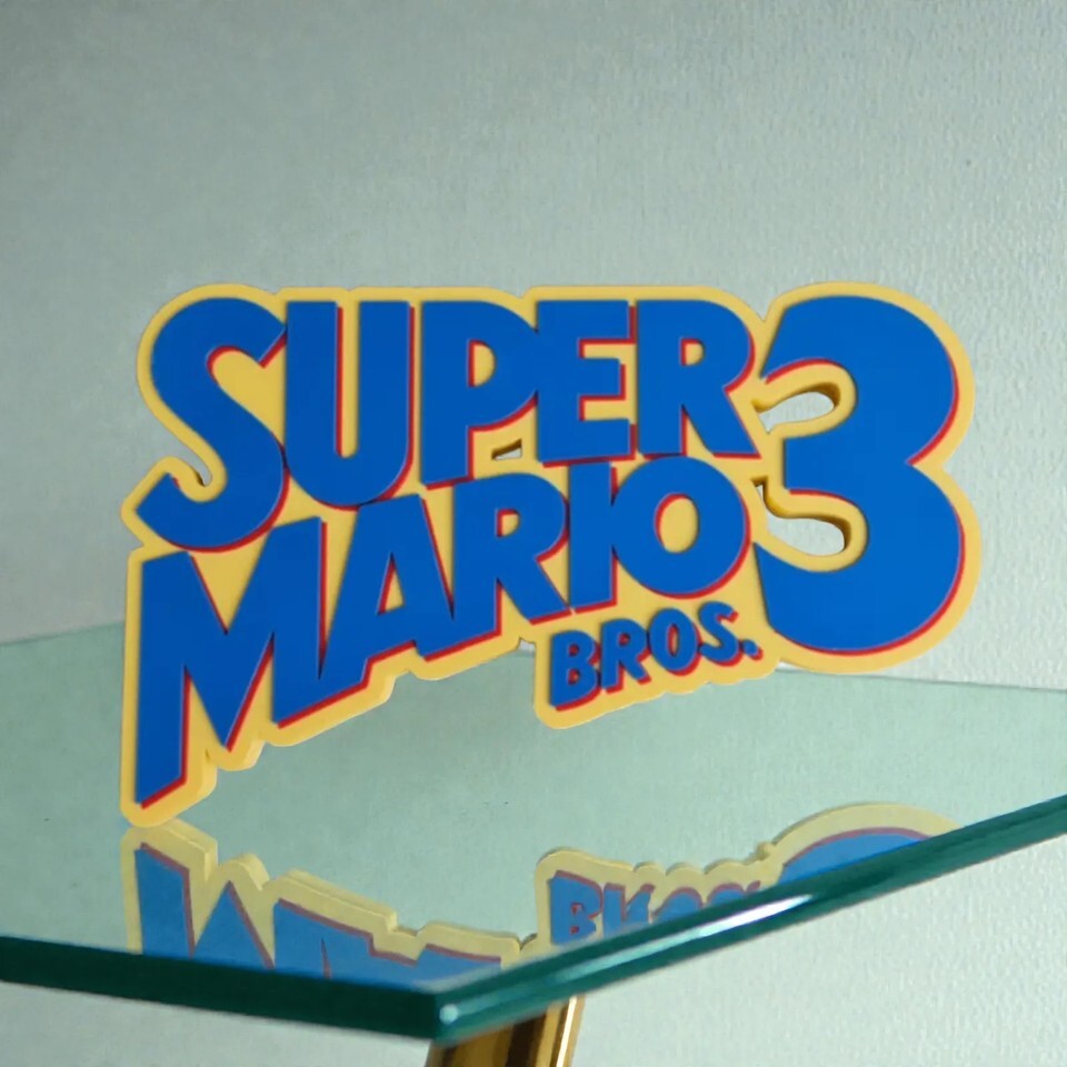 Bring a piece of classic gaming history to your space with this Super Mario Bros 3 logo sign. This 3D printed sign accurately replicates the beloved Nintendo NES era title, featuring vibrant blue and yellow colors with red detailing. It serves as a perfect decor piece for any game room, office, or collection, celebrating one of the most iconic video games. The sign is in excellent, new condition, ready to be displayed and enhance your gaming setup.