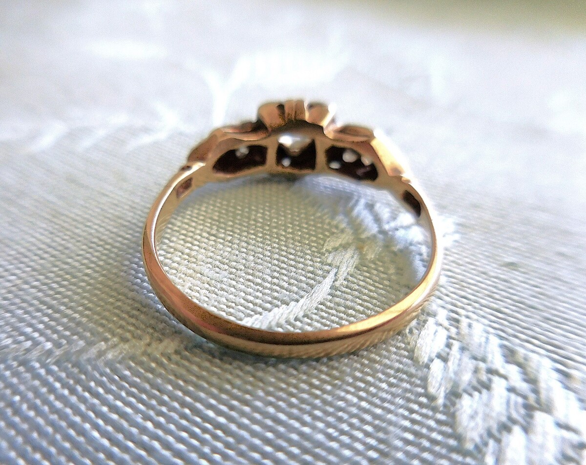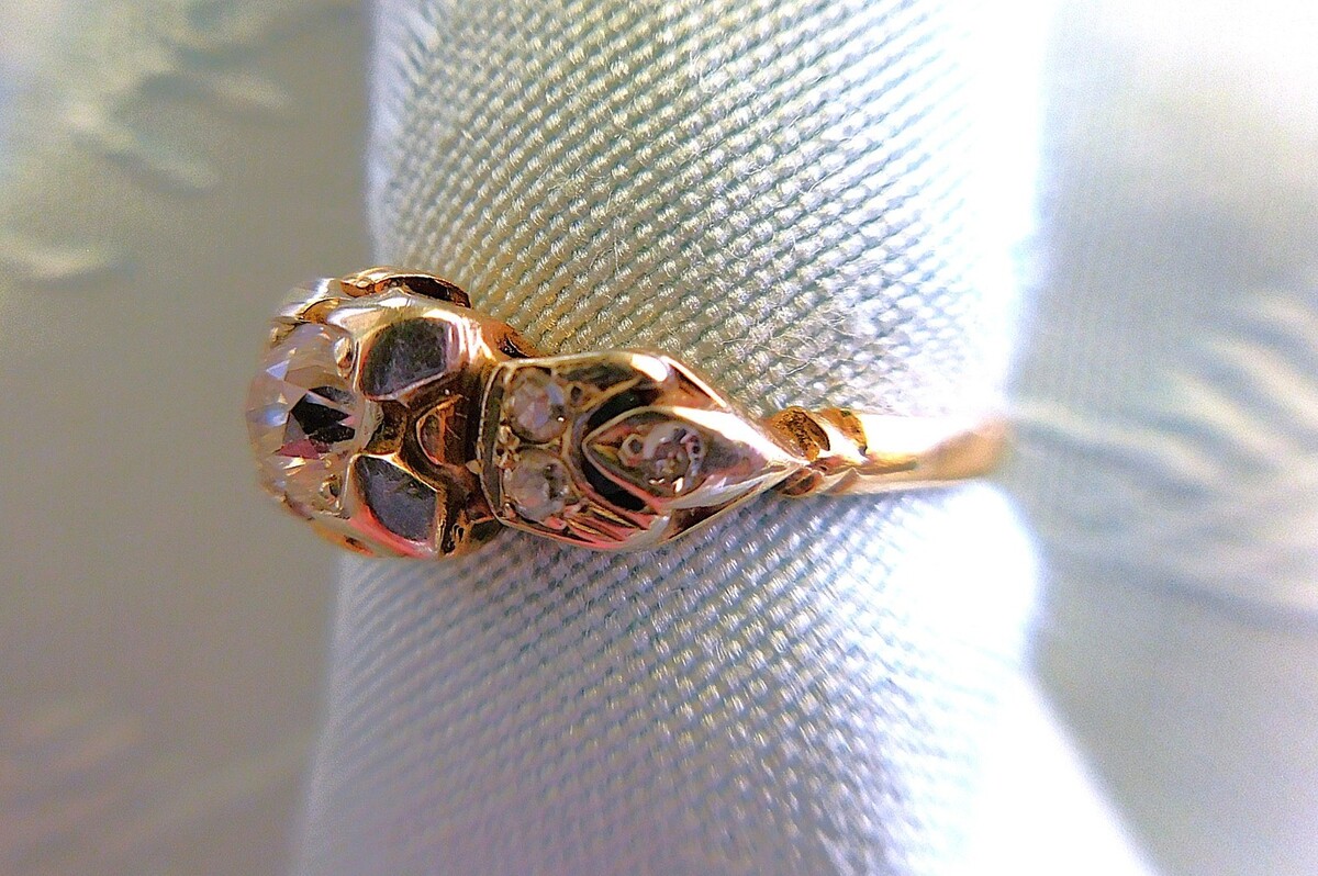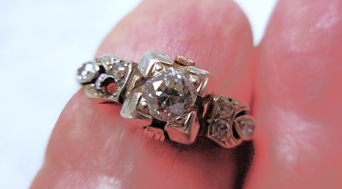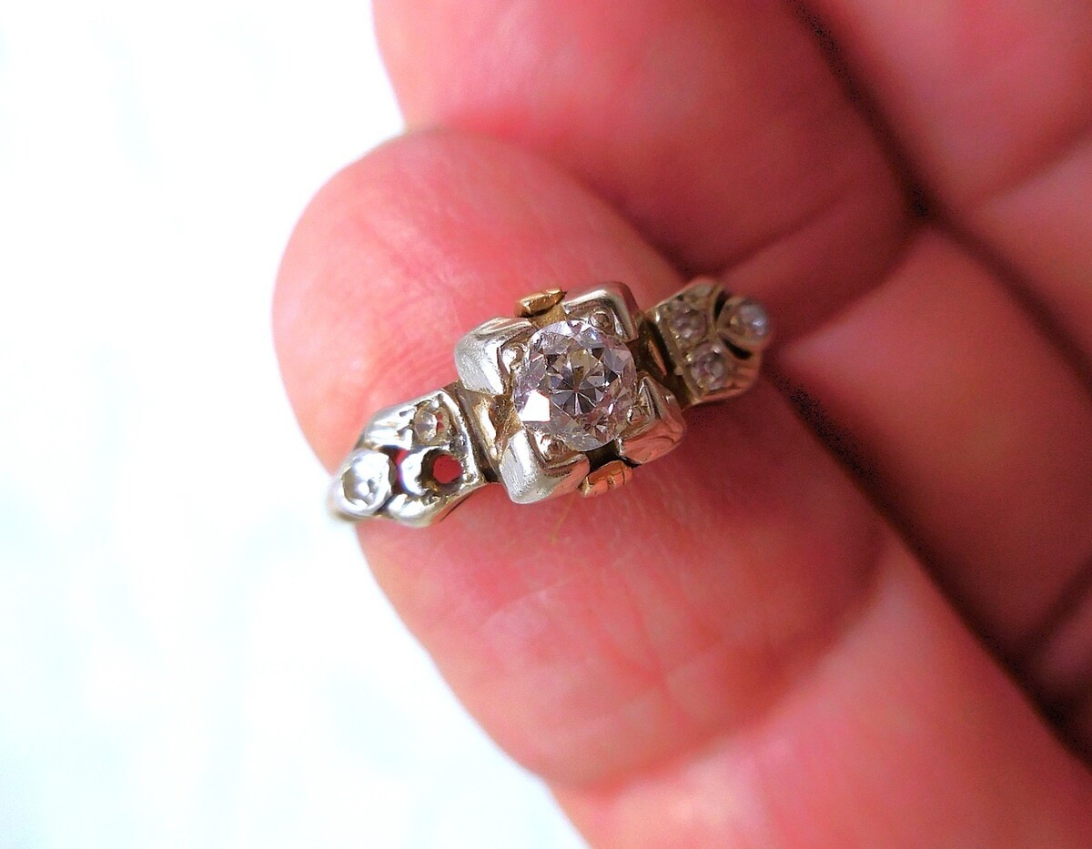 Lovely old heirloom engagement ring with a European cut diamond center and six additional smaller ones, three to each side. The center diamond measures 3.64mm and is approximately .17ct. The six small diamonds are approximately 1.25mm each. One small diamond is loose from the ring and is included inside the tube as seen in the photos. and are .05ctw, making the ring approximately .22ctw. The ring weighs 2.1 grams. Sold as is the heads are worn and need work for future security and reset the loose stone as well. Information is from an appraisal done for an estate from a jewelry store. No grade is given for the C's. Visually the larger diamond is eye clean, color is excellent. In a size 7. Beautiful ring!