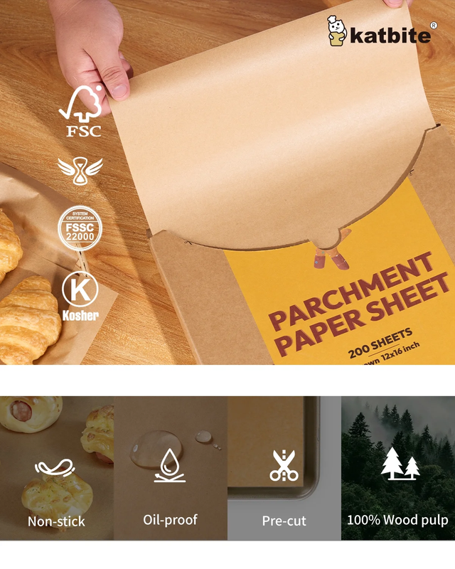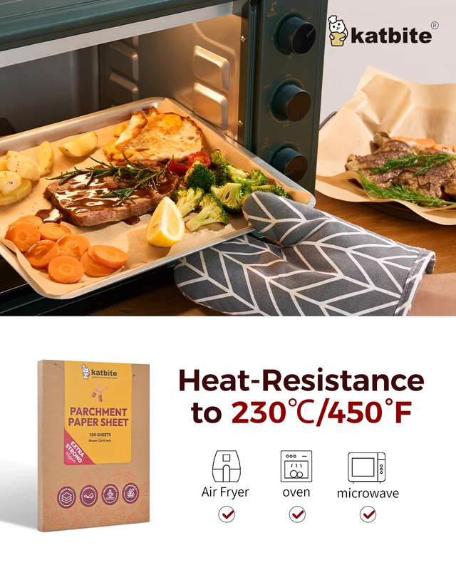 EXTRA STRONG - 200pcs pre-cut parchment paper sheets made of extra thicker 45gsm paper vs commonly used 35gsm or 40gsm paper, it's about 12% thicker than others'. PRECUT PARCHMENT PAPER SHEETS - Pull one of the pre-cut 12x16 inch parchment sheets out and it's ready to use. HEALTHY NON-TOXIC - Katbite parchment paper sheets 12x16 made from natural 100% wood pulp and totally fluorescent free. Food grade silicone coating makes your baking safe and non-toxic. MULTI-PURPOSE - Katbite 12x16 baking sheet?s temperature resistance is from -68 to 450 degrees Fahrenheit, you can find it everywhere in kitchen whether in freezer, microwave or air fryer as long as you can think of it. NON-STICK EASY TO CLEAN - Food can be easily slide off from the baking tray and you just need to remove the paper and throw it away after baking.