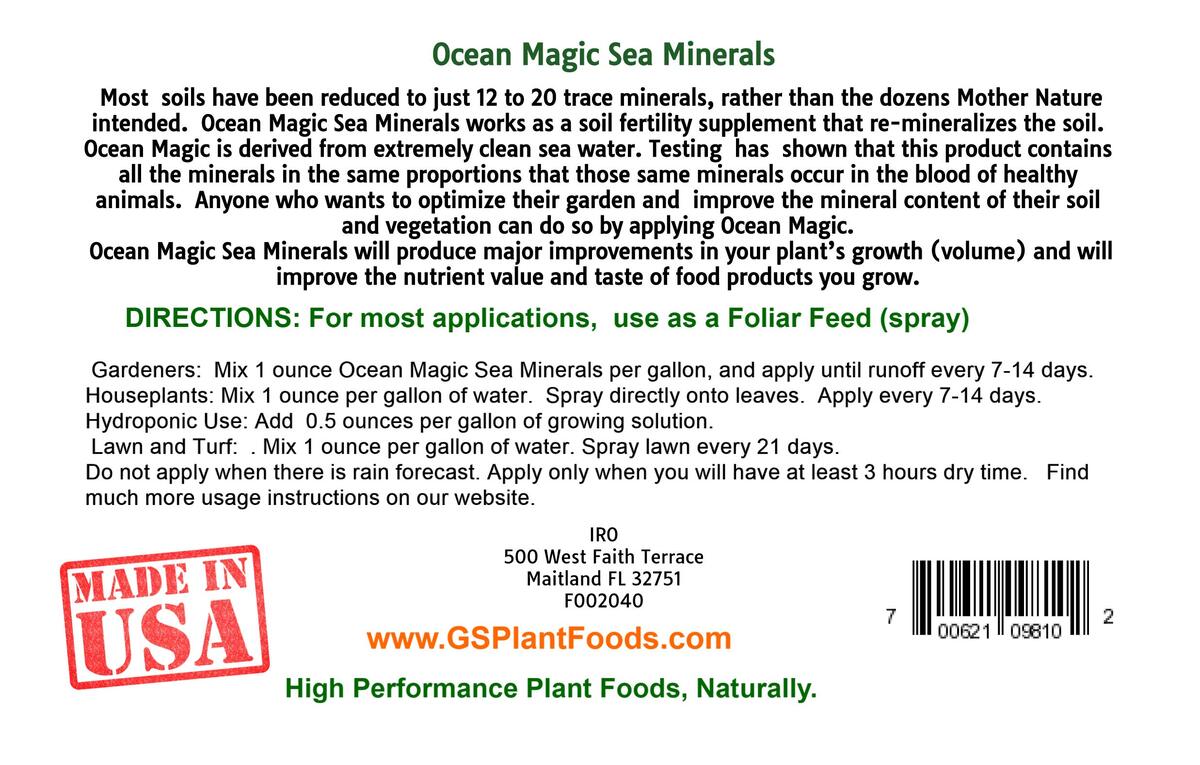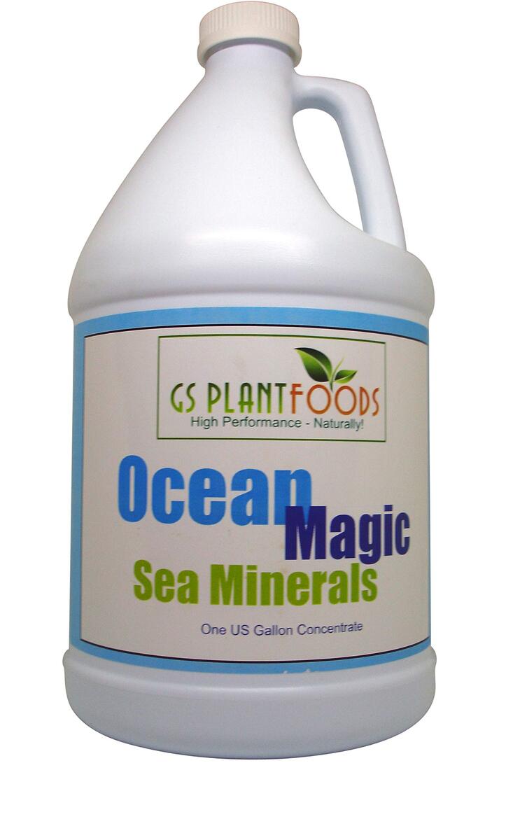 1 Gallon Liquid Concentrate- yields 64- 128 gallons. Ocean Magic Sea Minerals from GS Plant Foods. Most soils have been reduced to just 12 to 20 trace minerals, rather than the dozens Mother Nature intended. Ocean Magic Sea Minerals works as a soil fertility supplement that re-mineralizes the soil. Ocean Magic is derived from extremely clean sea water. Testing has shown that this product contains all the minerals in the same proportions that those same minerals occur in the blood of healthy animals. Anyone who wants to optimize their garden and improve the mineral content of their soil and vegetation can do so by applying Ocean Magic. GS Plant Foods' Ocean Magic is based on the 30 years of testing and experimenting by Dr. Maynard Murray. Ocean Magic is nearly 100% water soluble in contrast to rock powders which are not. Ocean Magic Sea Minerals is helpful to all types of soil and any growing conditions. GS Plant Foods' Ocean Magic Sea Minerals will produce major improvements in your plant's growth (volume) and will improve the nutrient value and taste of food products you grow. GS Plant Foods- High Performance Products for your Plants!