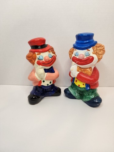 This vintage colorful clown piggy bank from 1970 is a unique addition to any collection. Made of ceramic and originating from Taiwan, this original piece features a fun clown design and comes with a stopper. Standing at 5 inches tall, this charming piggy bank is sure to bring nostalgia and whimsy to any space.