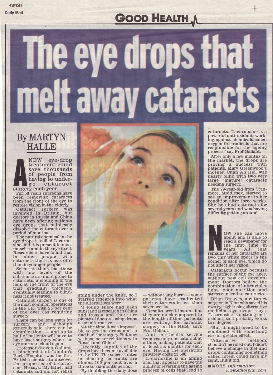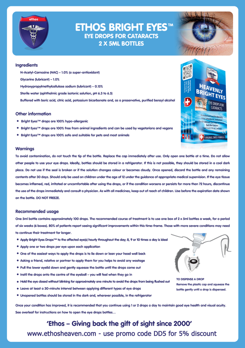 The early success of N-Acetyl-Carnosine Ethos Heavenly Bright Eyes Eye drops resulted in them being featured on the Richard and Judy Show 25 years ago. The continued success of the eyedrops in combating the problems of cataracts is testimony to the quality of our product; positive testimonials from people we have been able to help give us enormous satisfaction and we are here to help you as well.