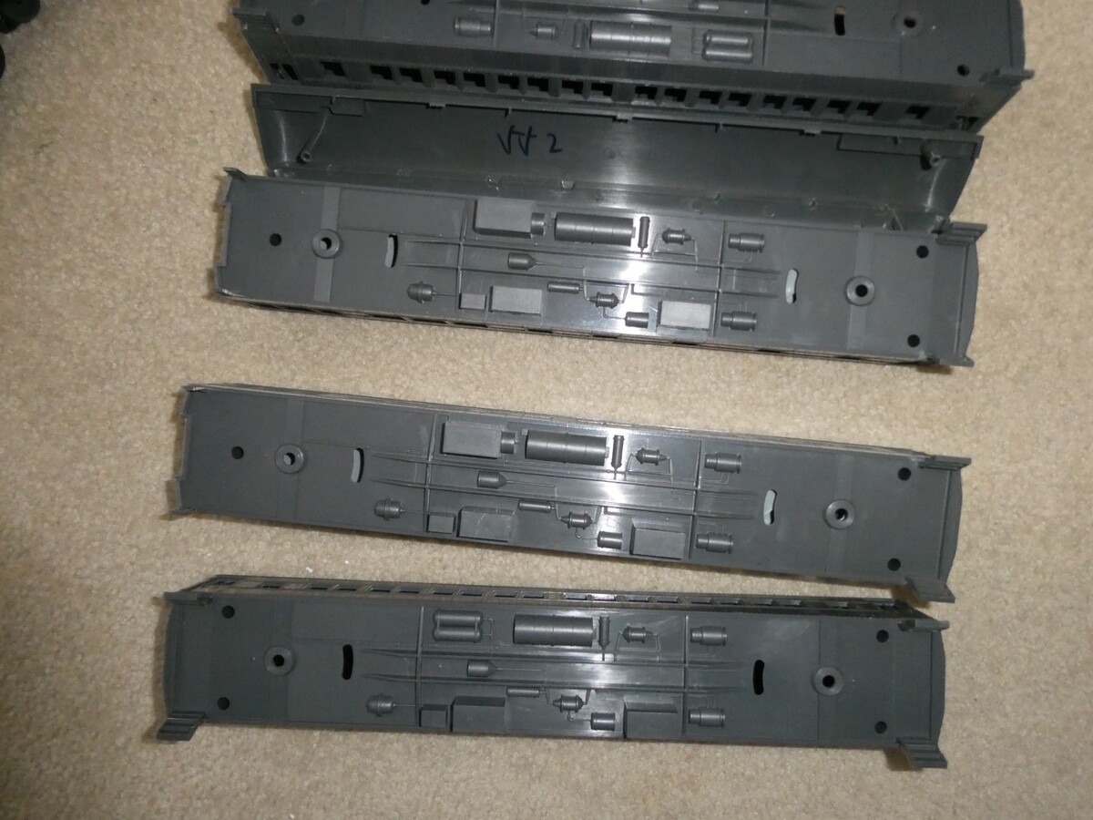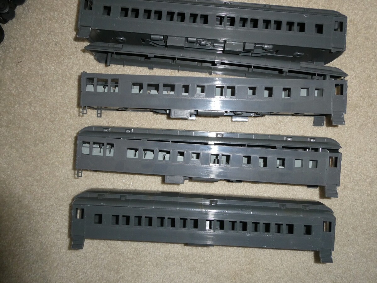 You are bidding on a nice looking, MTH Railking O Gauge, heavyweight, undecorated lot of 4 passenger car bodies with roof sections, two have inside seat interiors, no trim, in the pictures. 15 inches long. Unused factory stock, some writing on inside roof, missing some inside screw posts, missing a few lower steps, light scrapes and scratches. Zoom in for details.