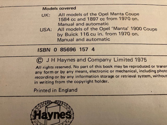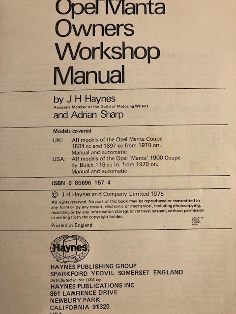 Haynes Opel Manta Coupe Model A 1970 To 1974 Owners Workshop Manual