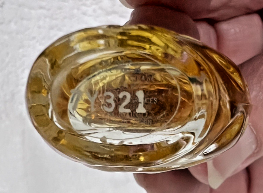 Ralph Lauren Safari Miniature Eau de Parfum Perfume France Crystal Spiral Sun Bottle. Miniature Ralph Lauren France Safari perfume bottle has an impressed spiraling sun or some such measures approx. 1 5/8" tall, appears full 1/8 fluid ounce. See pictures.