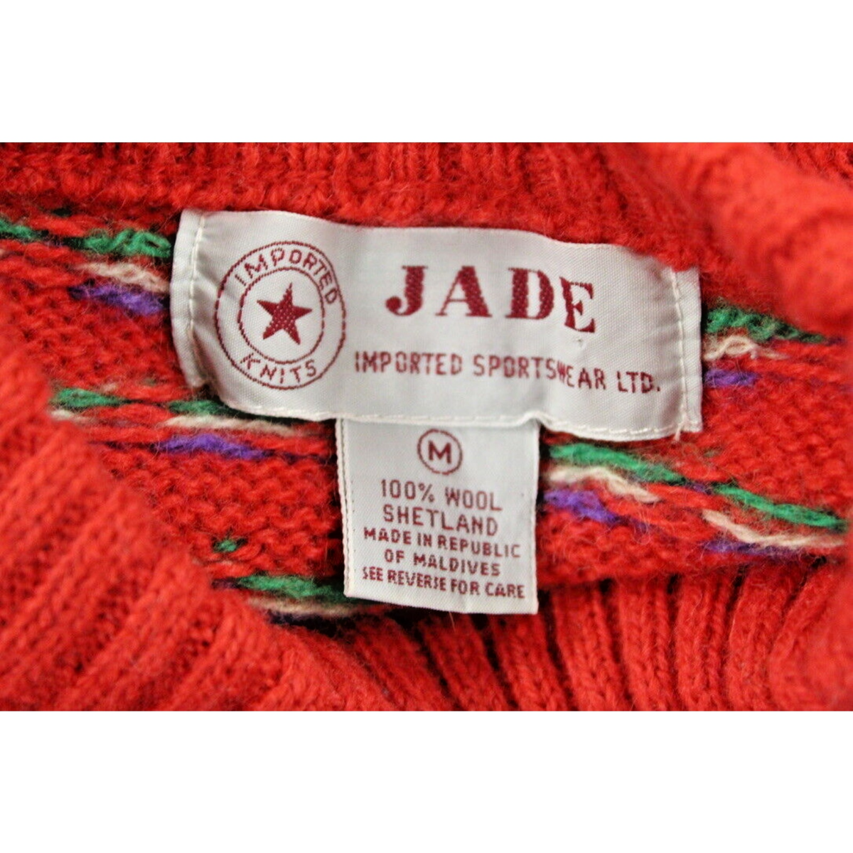 Shetland wool sweaters have been wardrobe staples for over a century, prized for their durability, warmth, and vibrant colorwork. The Jade label offered quality knitwear with a nod to midcentury silhouettes, making this piece a crossover between heritage menswear and retro women?s style.