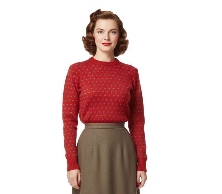 Retro vintage Jade Shetland wool sweater, crafted in 100% Shetland wool with a bold red base accented by purple and green intarsia patterns. With its long 3.5" ribbed cuffs and waistband, this piece channels a 1940s-inspired heritage look while offering versatile unisex wear.