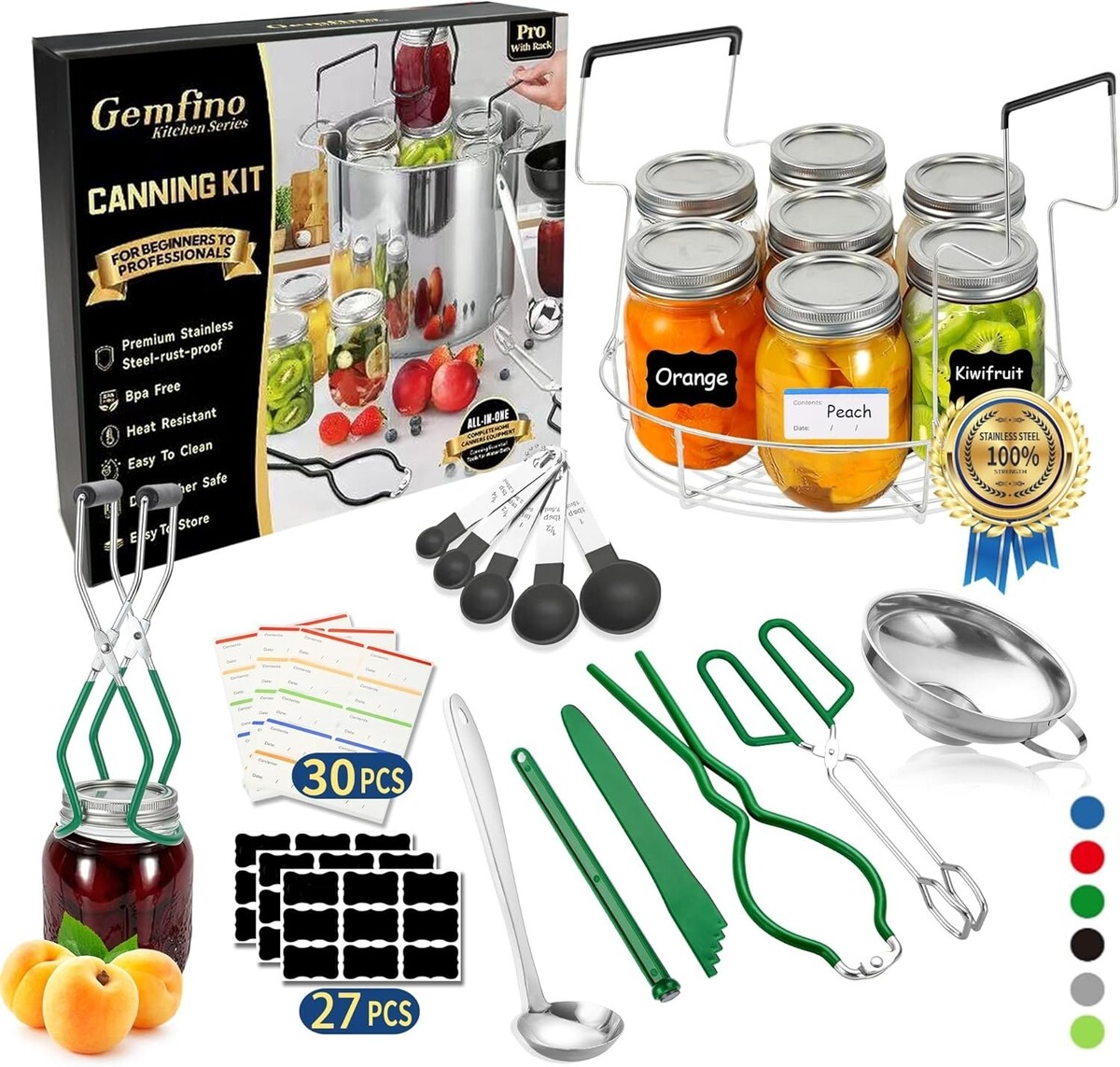 Set Includes: Rack,Stainless Steel Steamer Rack,Stainless Steel Canning Funnel,Canning Tongs,Jar Wrench,Mason Jar Lifter,Bubble Popper,Magnetic Lid Lifter,5-in-1 Measuring Spoon,Stainless Steel Ladle,Canning Labels