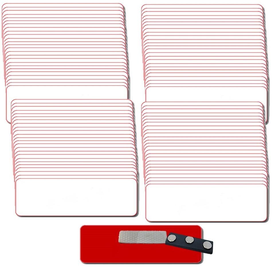 100 BLANK 1 X 3 WHITE / RED NAME BADGE KIT (U) TAGS 1/8" CORNERS MAGNETS LABELS