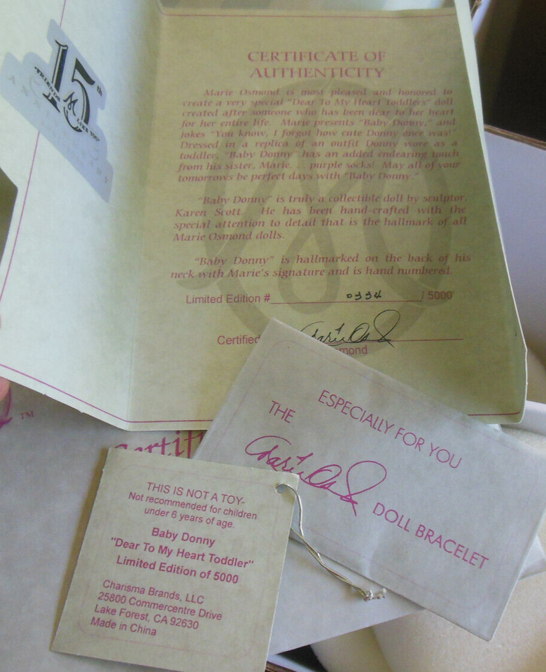 Includes a Manufacturer's Certificate of Authenticity and a Marie Osmond bracelet.