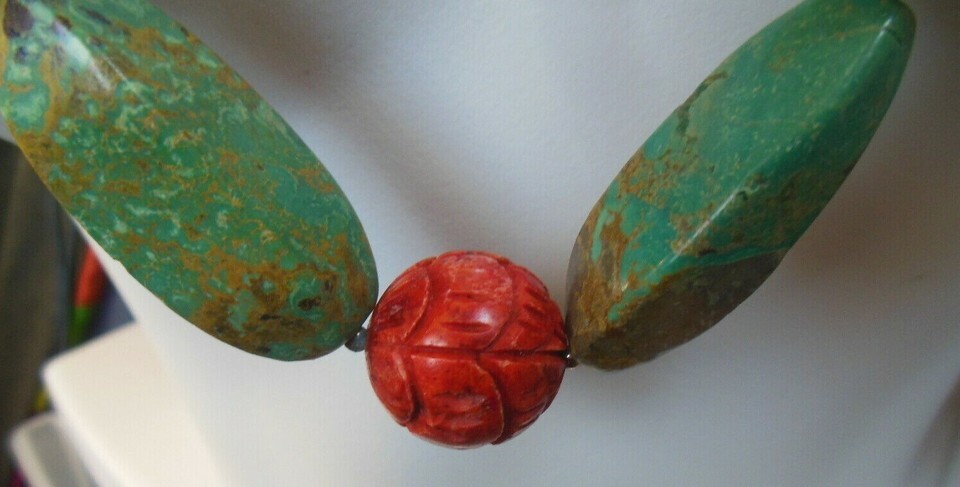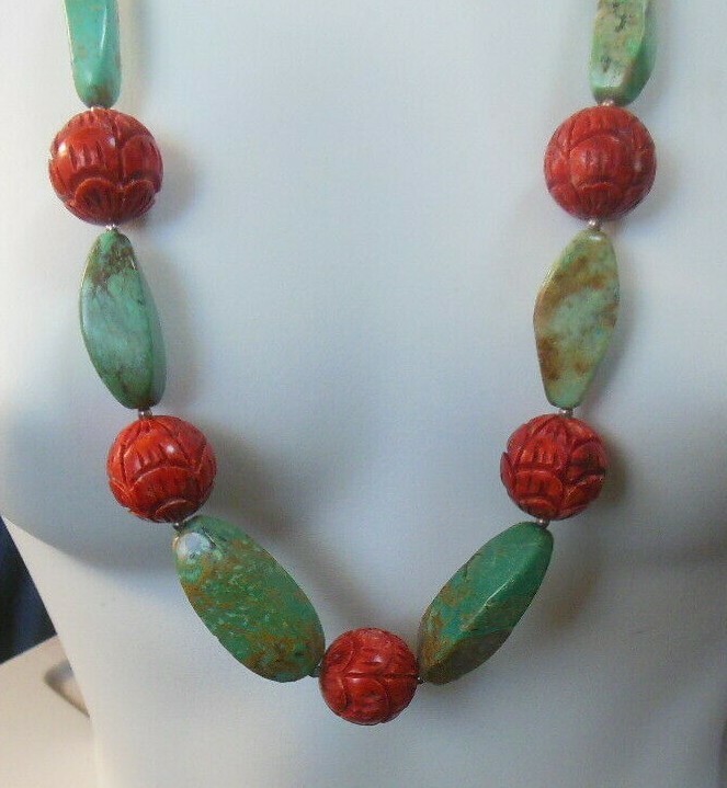 BARSE Massive Turquoise & Carved Coral Necklace W/Sterling Silver Spacers/Clasp