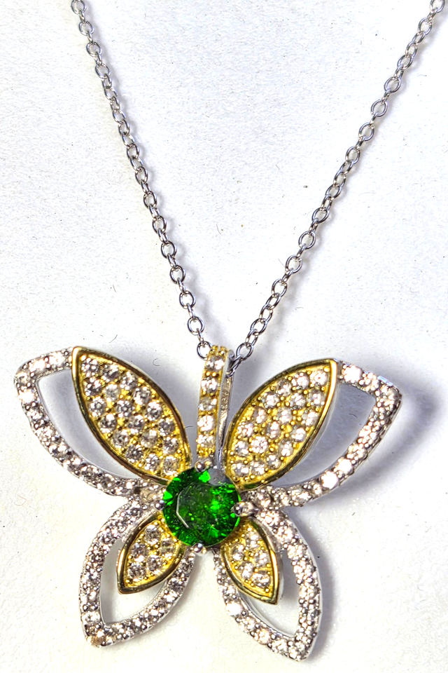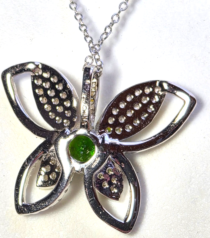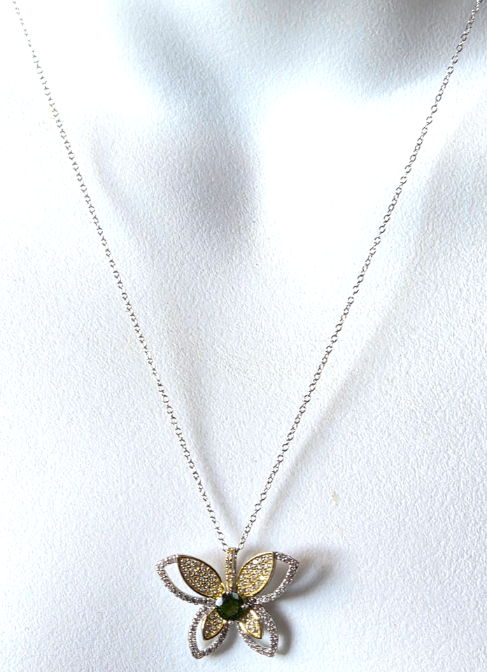 Designer 925 Sterling Silver Butterfly Pendant Emerald & Pave Diamond 18"