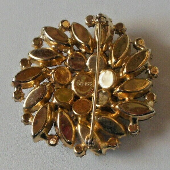 Vintage Signed WEISS Pinwheel Brooch Set Amber Color & AB Rhinestones