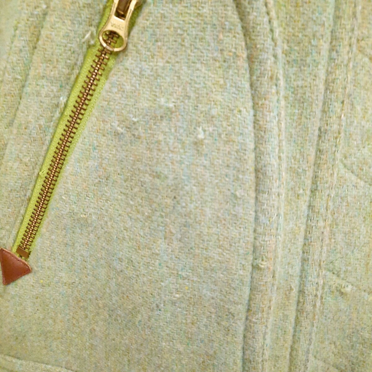 Some flaws/pulls and a mark(on the hem under the snaps), as shown. Light green with faux fur hood. Snaps over zipper.