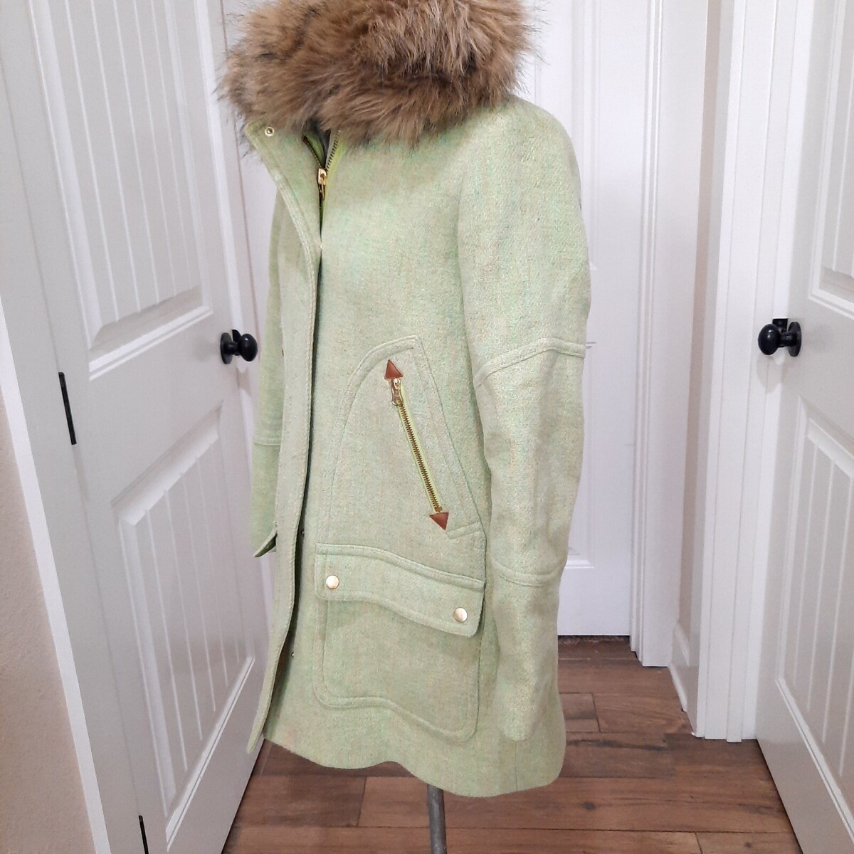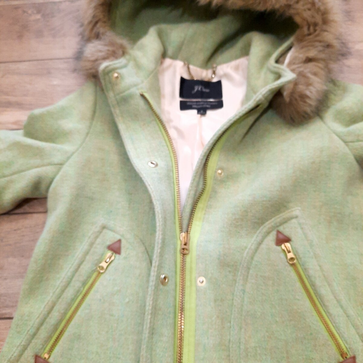 J.Crew Nello Gori Italian Stadium Wool Coat Jacket Size 4 green faux fur hood