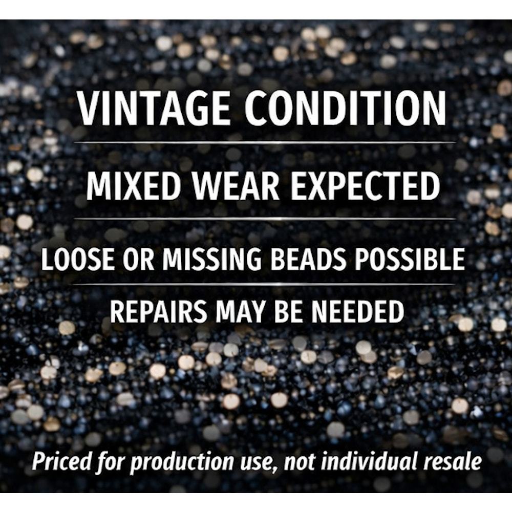All dresses are vintage and pre-owned. Condition ranges from good to fair. Expect loose beads, missing beads, light pulls, or minor structural wear typical of heavily embellished garments from this era. No major rot or unusable pieces included. Repairs and reinforcement should be assumed for production use. Light residual storage scent possible.