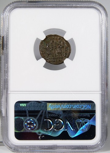 This coin comprises one of the coins found in the Epfig Hoard. Originally discovered in 2010 in the small town of Epfig, in the Alsace-Lorraine region of France, these coins were part of 110 kg of Roman treasure hidden away in three large ceramic pots. For over 1600 years, these coins were buried and kept in stunning condition. This Roman Coin of Constantius II has been graded in AU (About Uncirculation) condition by NGC. It is truly rarest of of the rare Ancient coins to have a pedigree stretching to the original time of coin in circulation including original find spot AND rated R4-R5 Rarity in RIC (R5=unique/nearly unique)!