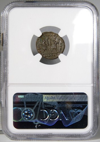 Ref. RIC VII Arles 346 R4 (variation-no dot center between standards--unlisted without dot! Rarity ~ this specimen also includes dot in center on reverse--unlisted=r5.