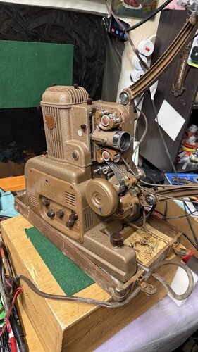 Keywords: Model KS-17405, Vintage 16mm projector, AMPRO Corporation Chicago, Simpson lens 2 inch, Kodascope reel, oil can, Film projector for parts, Projector powers on, Motor belt turns, Projection bulb not working, Sold as-is, Repair or restoration, Collector item, Home movie projector, Educational film equipment, Distressed case, Empty reel included, Brittle power cord, Not fully tested, No reel movement, Durable vintage build, Compact dimensions (15x8x6.25 inches), Rare vintage electronics, Retro film gear, Antique projector, Mid-century AV equipment, Classic movie projector, Old-school film tech, Restoration project, Display piece