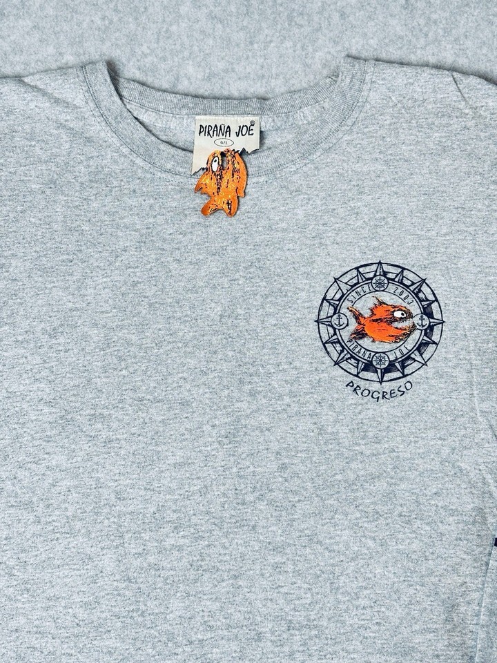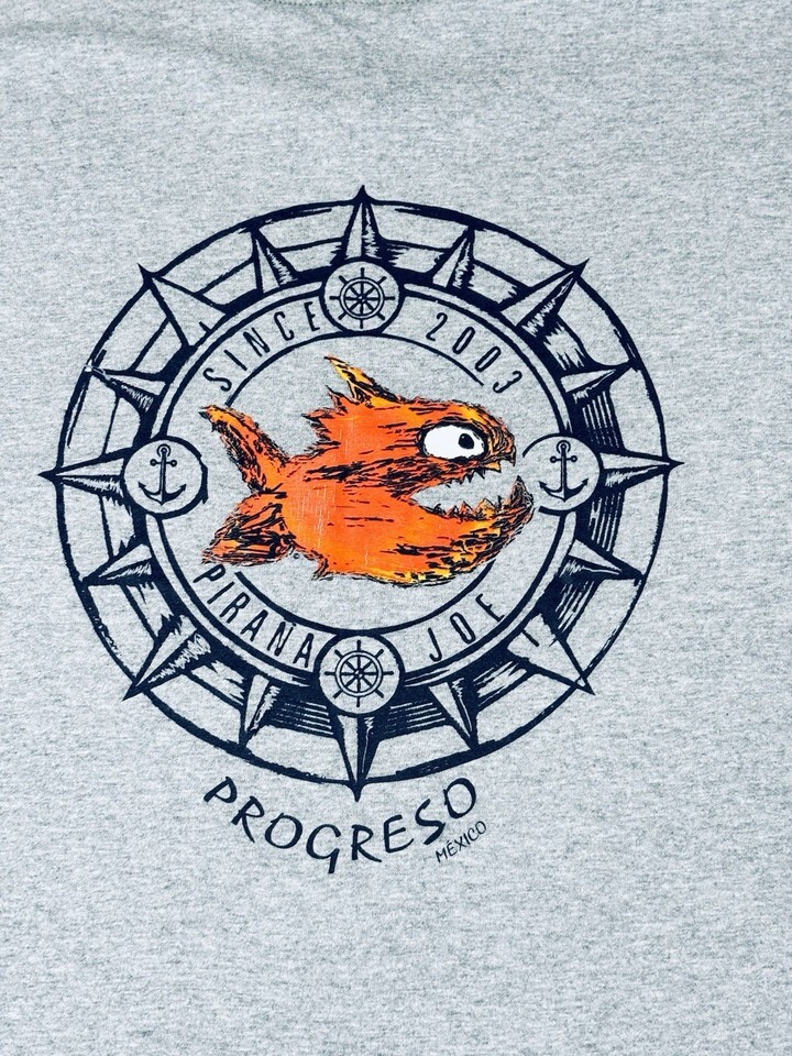 Pirana Joe Long Sleeve T Shirt Gray - Fish Tag - Progreso Mexico - 100% Cotton Compass